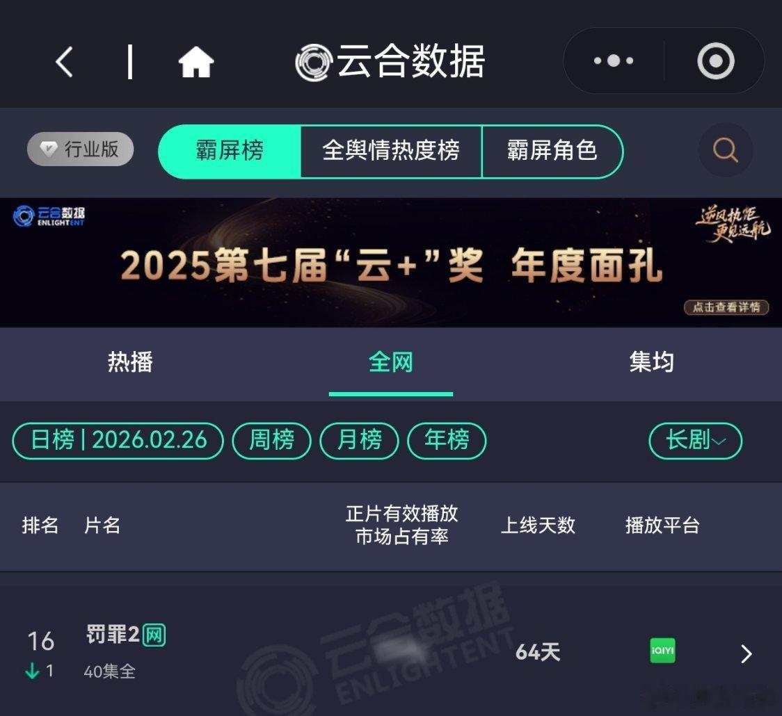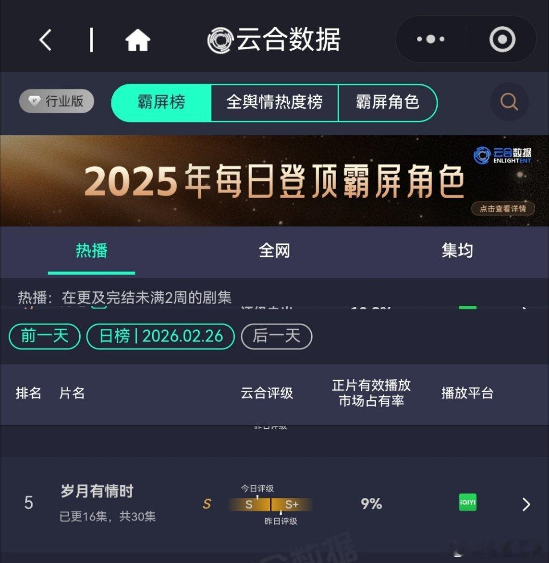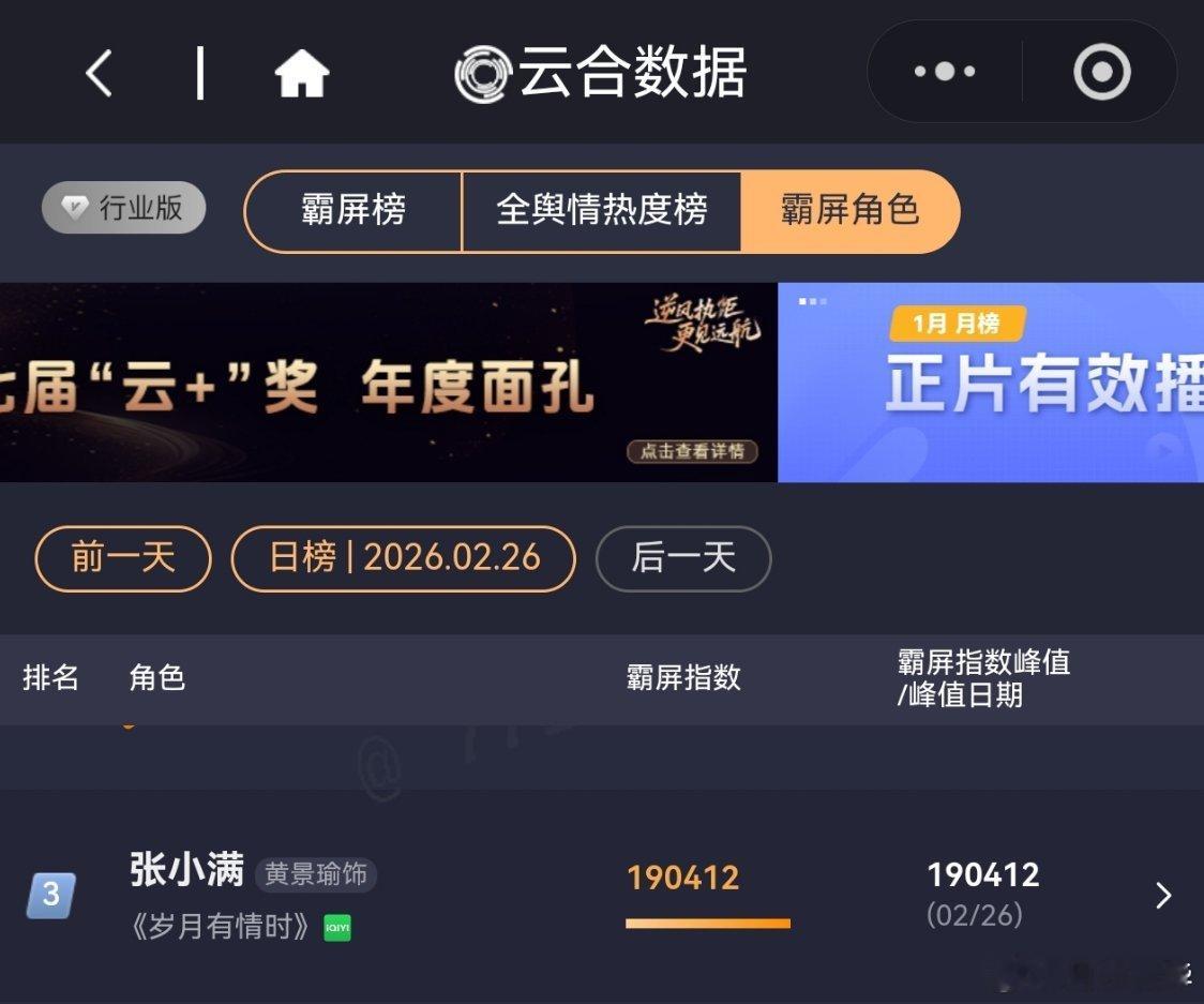 2月26日,黄景瑜岁月有情时 开播第7天,云合第5,霸屏榜黄景瑜张小满 第3,酷云点播第4。黄景瑜罚罪2 云合热播期结束第12天,上线第64天,全网第16。黄景瑜秦枫 ,罚罪,网络剧榜第19,冬至第25。