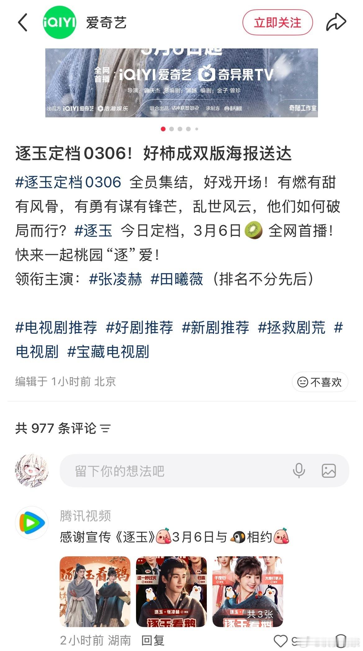🐧自己都这么说了~上一部在鹅看完的剧是《子夜归》,这次肯定能看完腾讯感谢爱奇艺宣传逐玉