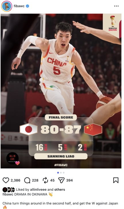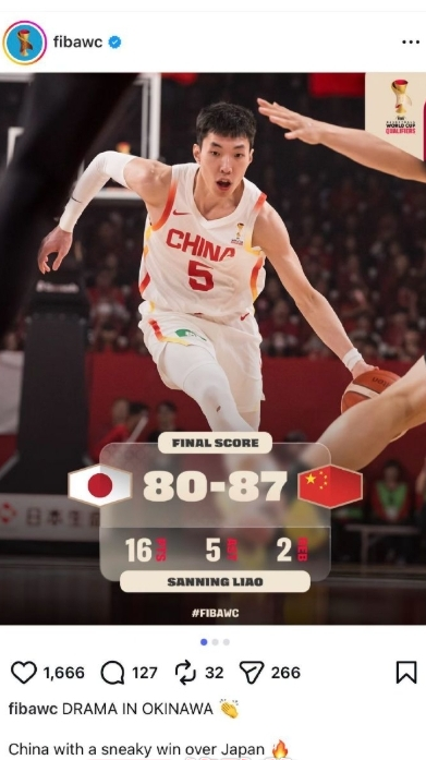 赛后,FIBA官方在社媒上发布本场比赛赛果,并配文:“asneakywin”。而“sneakywin”往往被形容为出乎意料的胜利。