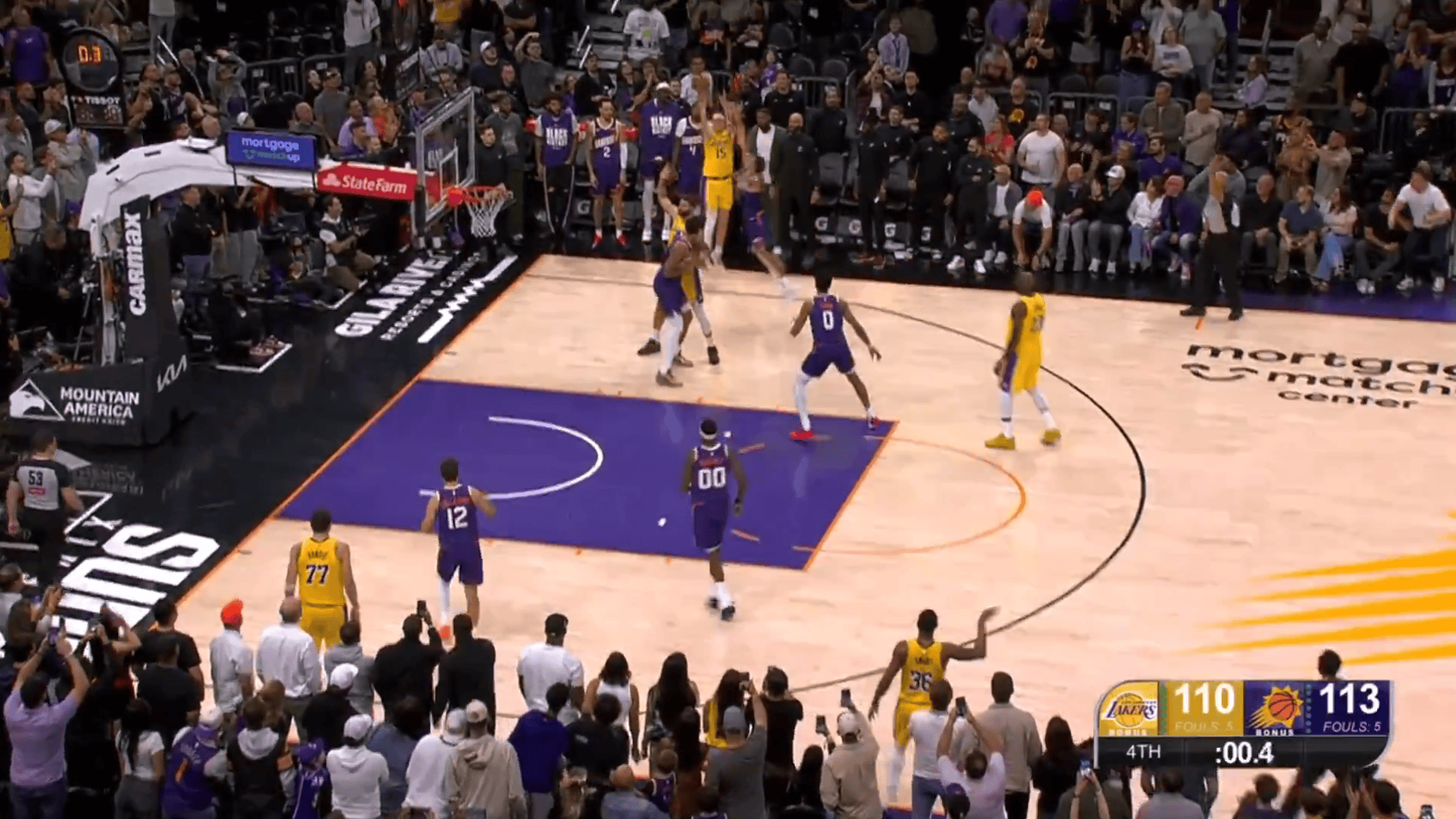 比赛第四节,罗伊斯-奥尼尔三分命中,太阳剩0.9秒准绝杀湖人。