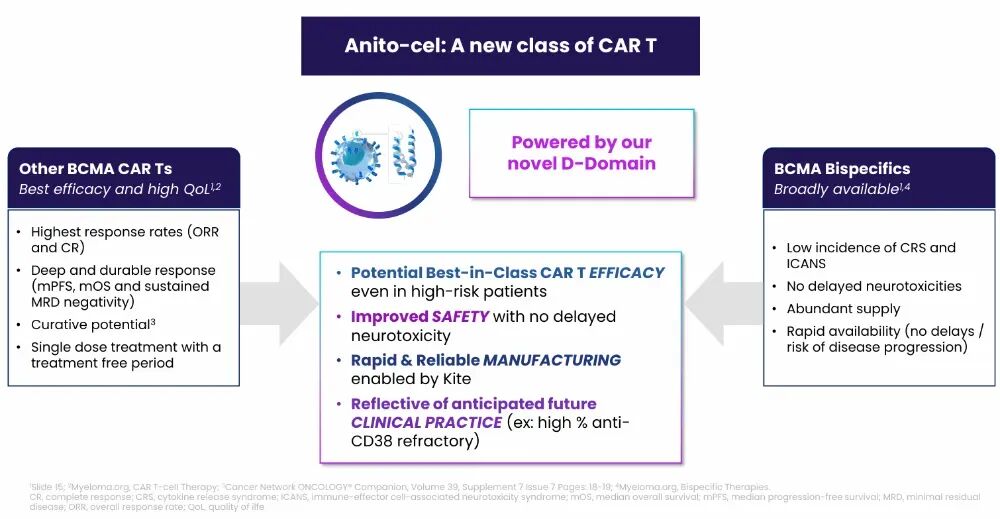 吉利德/Arcellx:anito-cel——疗效与Carvykti持平(ORR96%),安全性显著领先(无延迟神经毒性),技术更具创新性(D-domain),且布局更早线、多领域,未来增长潜力最大。