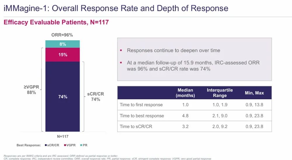 这项pivotalII期试验,共纳入了117例复发/难治性多发性骨髓瘤患者,这些患者均接受过至少3线既往治疗,其中不乏对传统化疗、免疫调节剂、蛋白酶体抑制剂耐药的患者,属于临床上治疗难度极高的群体。经过中位15.9个月的随访,anito-cel交出了一份近乎完美的答卷:
