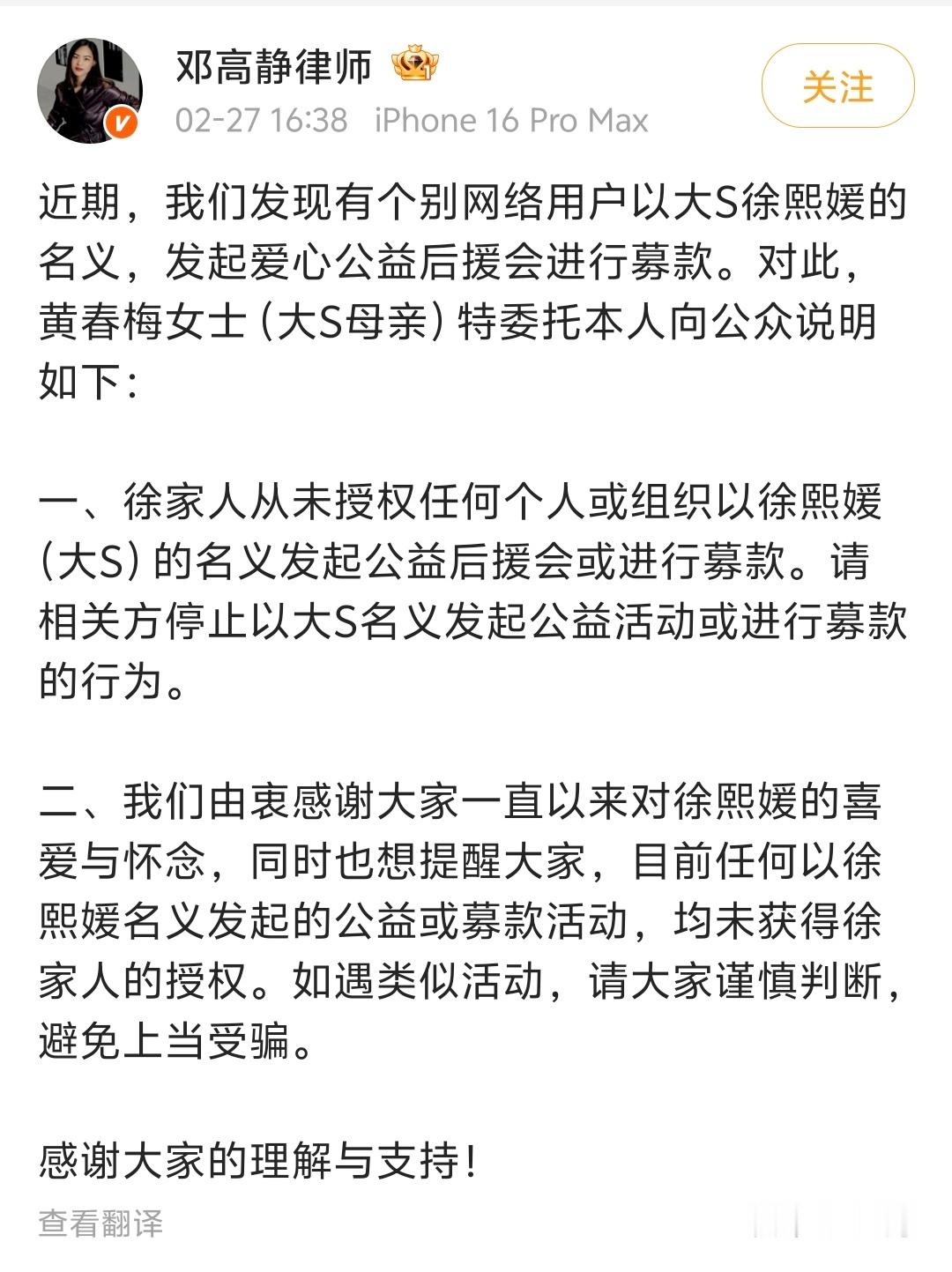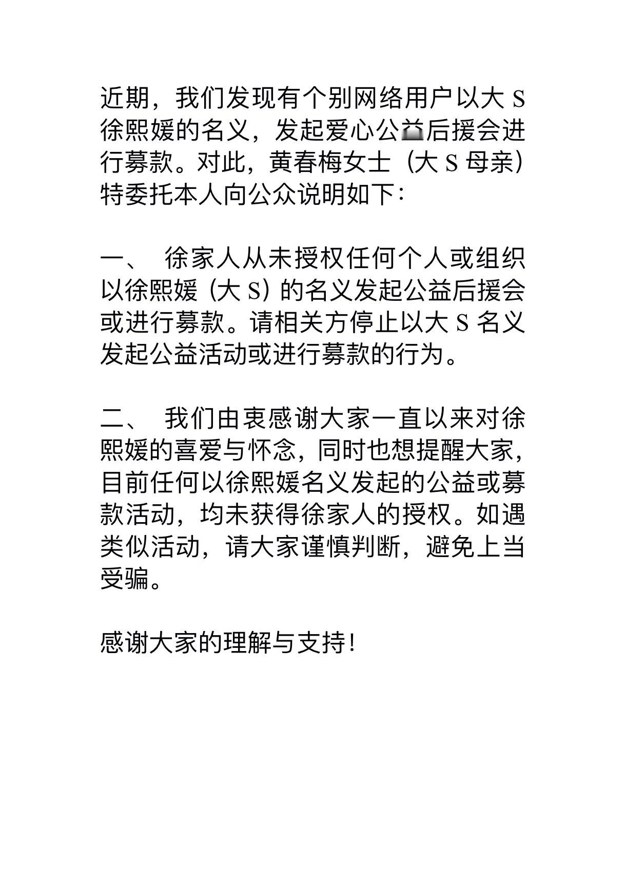 【徐家未授权以大S名义发起公益后援会】以大S名义发起的募款均未获授权 近期,有个别网络用户以大S徐熙媛的名义,发起爱心公益后援会进行募款。27日,黄春梅(大S母亲)委托向公众说明如下:1️⃣徐家人从未授权任何个人或组织以徐熙媛(大S)的名义发起公益后援会或进行募款。请相关方停止以大S名义发起公益活动或进行募款的行为。2️⃣目前任何以徐熙媛名义发起的公益或募款活动,均未获得徐家人的授权。如遇类似活动,请大家谨慎判断,避免上当受骗。