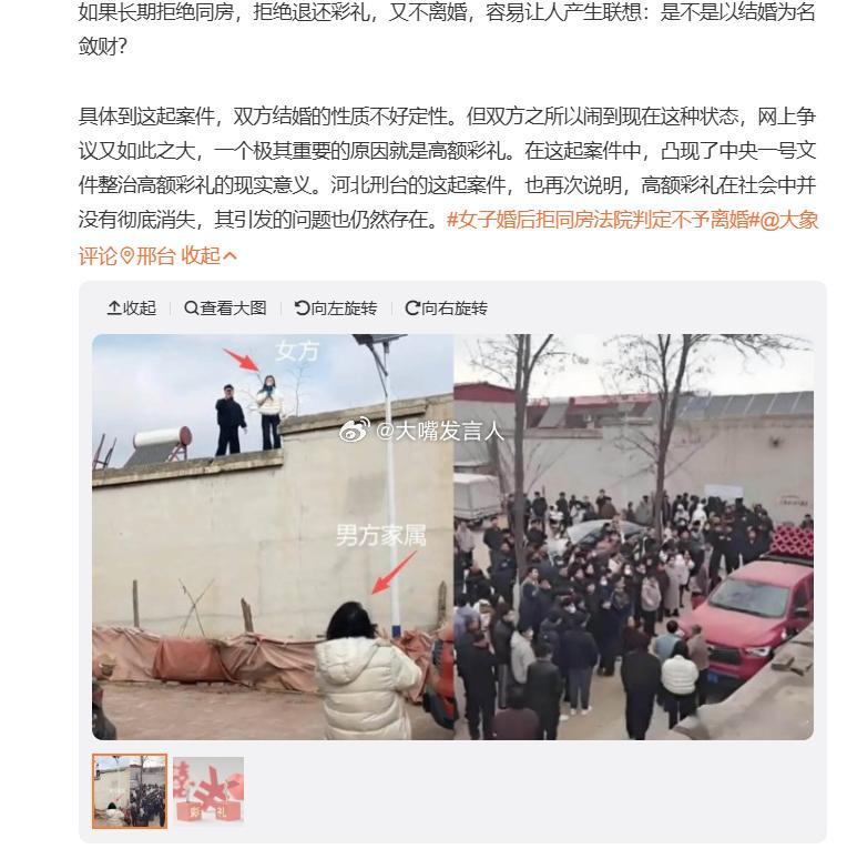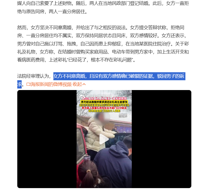 女子拒同房不离婚为何引争议 之前的山西案件,一帮媒体踊跃告诉大家,订婚不等于性同意(图1),今天这个案件是已婚,还是不同房、没有性同意,怎么办呢?前述媒体今天还发言吗?报道中说,当庭认为,“女方不同意离婚,且没有双方感情确已破裂的证据,驳回男子的诉求(图2)”,是不是在法庭现场大打出手,才能证明感情确实破裂了、裂得不能再裂了呢?被男方指婚后拒绝同房女方发声,女子婚后拒同房法院判定不予离婚,热点观点