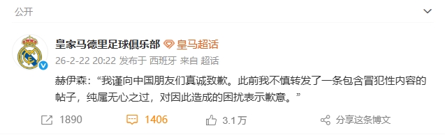 而此前针对赫伊森转发辱华种族歧视的帖子,皇马官方仅在微博和B站的国内平台发布。