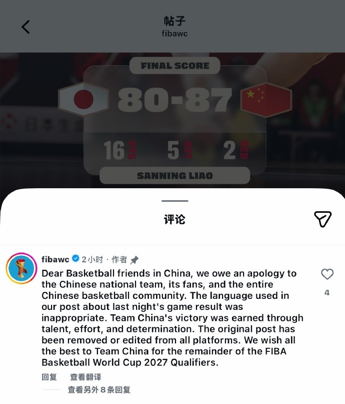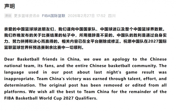 直播吧02月27日讯FIBA国际篮联官方今日声明,因昨日中国男篮战胜日本男篮的比赛结果帖子中的措辞不当,而向中国男篮、中国球迷以及整个中国篮球界致歉,并同步在国内外平台上。