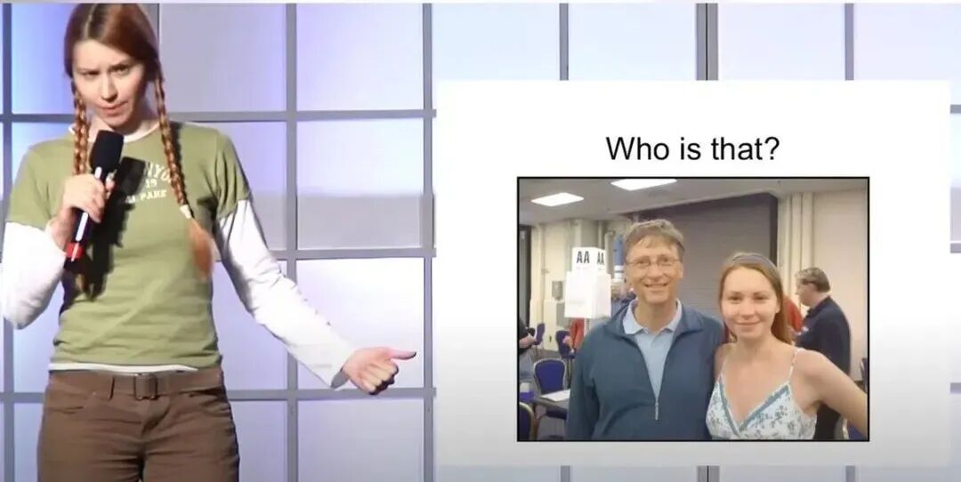 ·2010年,安东诺娃(左)在演讲中“炫耀”自己认识比尔·盖茨。(视频截图)