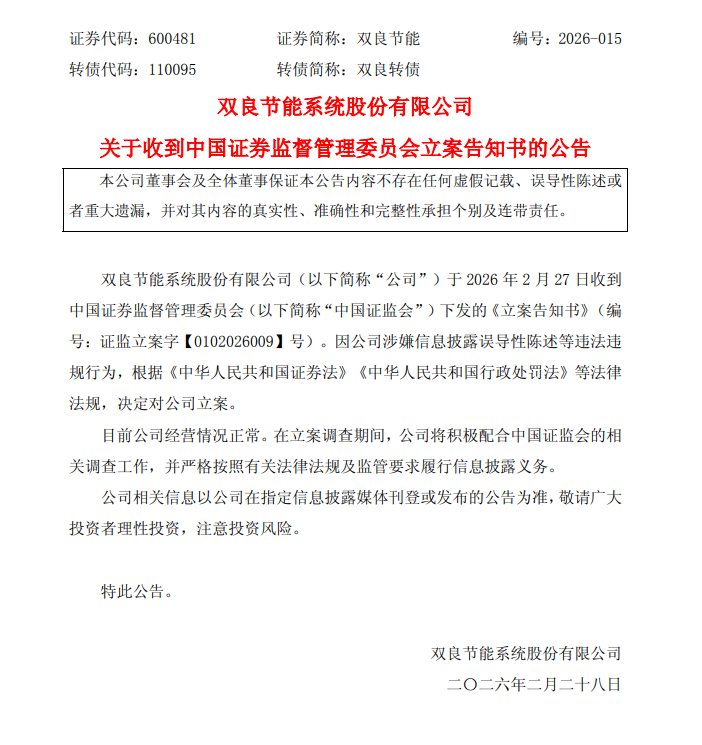 2月27日,双良节能(600481.SH)公告称,公司于2026年2月27日收到中国证监会下发的《立案告知书》,因公司涉嫌信息披露误导性陈述等违法违规行为,根据相关法律法规,决定对公司立案。目前公司经营情况正常,在立案调查期间,公司将积极配合调查工作,并严格履行信息披露义务。