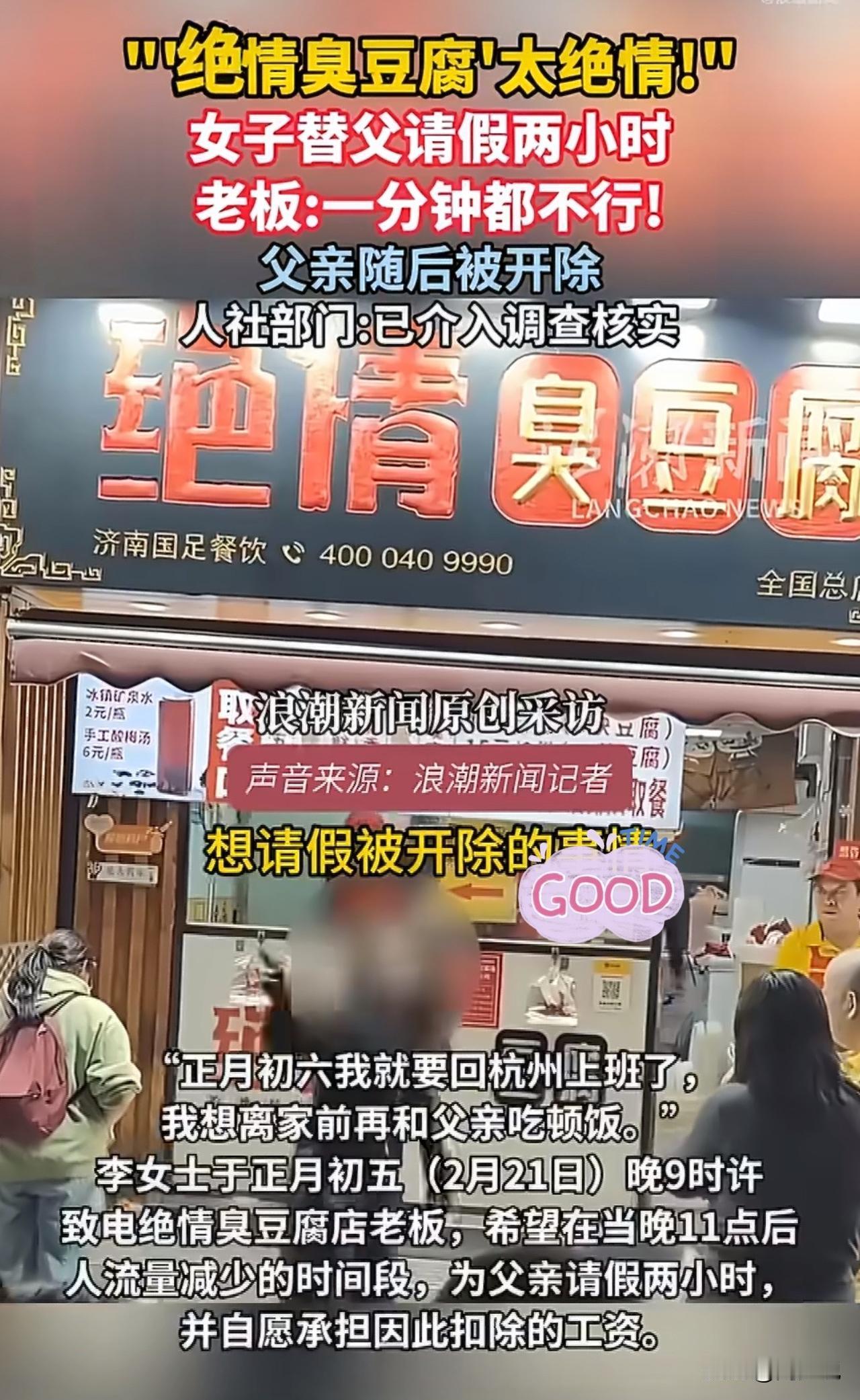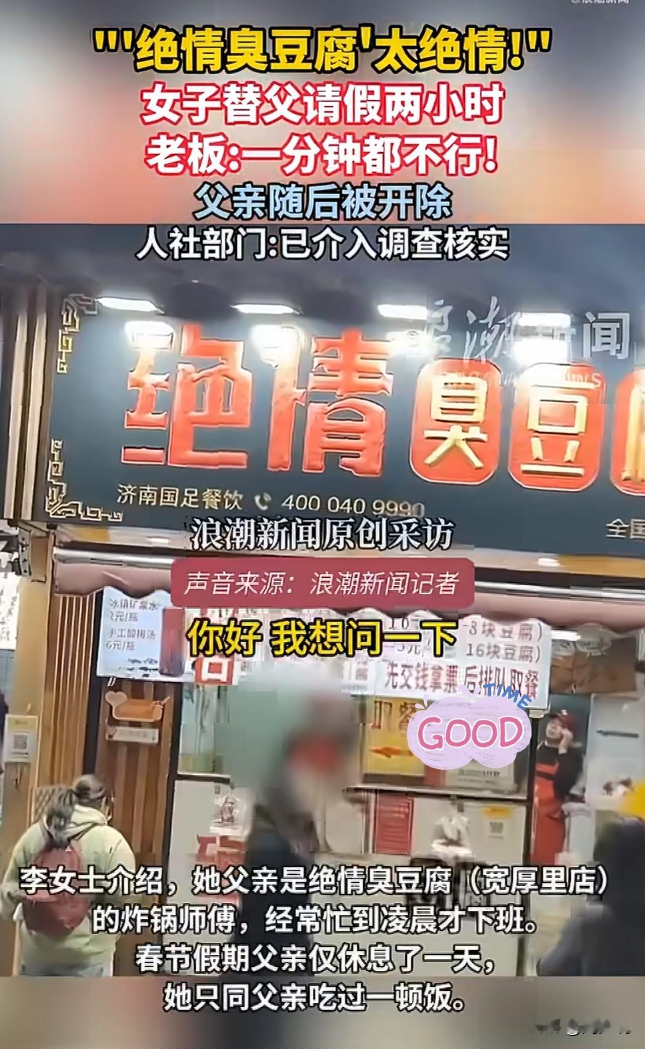 #媒体评替父请假两小时父亲被开除#“替父请假2小时吃团圆饭竟被辞退!”近日,济南“绝情臭豆腐”店的这起风波,狠狠戳中了无数人的心。 李女士即将返回杭州上班,整个春节,父亲只休了一天,父女俩匆匆吃过一顿饭。想着临走前再陪父亲吃顿饭,她特意选在深夜客流低谷,替炸锅师傅的父亲请两小时假,还主动提出扣工资。可老板一句“一分钟也不行”,转头就威胁辞退,当晚便把人开了。 视频传到网上,网友们坐不住了。有人说:“店名是噱头,人心是真冷”。 也有人感慨:“老实干活的人,不该被这样对待”。 面对采访,店员要么怼“关你什么事”,要么甩一句“不实信息”却不肯细说,态度着实让人寒心。目前,当地人社与街道已介入调查,是否违法用工,很快会有答案。 可以说,这件事闹到全网皆知,周少觉得从来不是因为两小时假期,而是底线被踩在了脚下。父亲常年加班、极少请假,是店里的主力,这份付出,没换来体谅,反倒成了被拿捏的理由。亲情与孝心,本是最朴素的情感,却被冰冷的利益挡在门外。 客观的说,小生意靠人气,更靠人心。制度要守,但人情味不能丢。对员工多一分体谅,未必会耽误生意;可把人逼到绝路,口碑塌了,再想捡起来就难了。 总而言之,作为老板一定要深知,底层打工人的尊严与权益,从来不是小事,依法用工、心存善意,或许才是长久经营的正道。#周少说教育# #寻美三湘#