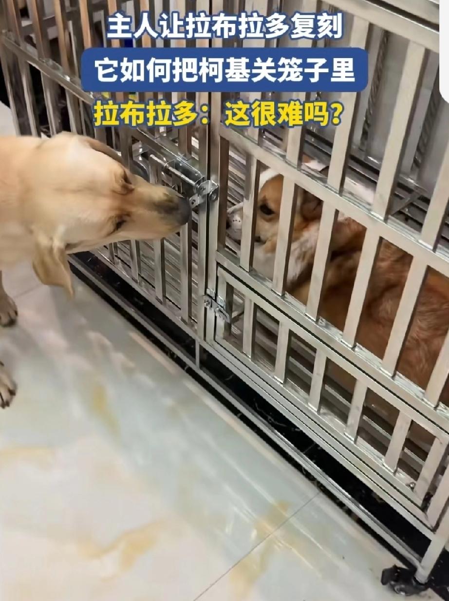 6月26日,湖南。主人养了两条宠物犬,一条拉布拉多,一条柯基。这两条犬虽然是不同品种,却能像亲兄弟一样,在一起生活,相处亲密无间。拉布拉多聪明,柯基温顺。拉布拉多像哥哥关照弟弟一样,关照柯基。柯基也很听拉布拉多的话。 主人发现,他明明记得,把柯基和拉布拉多一起放出笼子。可是柯基还被关在笼子里,并且笼子门外面的拉栓,被拉上了。 主人大惑不解,柯基的腿那么短,不可能扒到拉栓,它是如何把自己关住的?主人打开笼子,让柯基演示一下。 拉布拉多过来了,它来解开了主人的迷惑。只见它用了三招,就把柯基关在笼子里。第一招,站在笼子门外,示意柯基进去。第二招。待柯基进去后,用头顶,把门关上。第三招,用嘴把门拴上。做完这三步,望着主人,似乎在问,这很难吗? 这两条犬确确实实配合默契,聪明又可爱。 狗狗演示怎么把柯基关笼子里 动物的迷惑行为