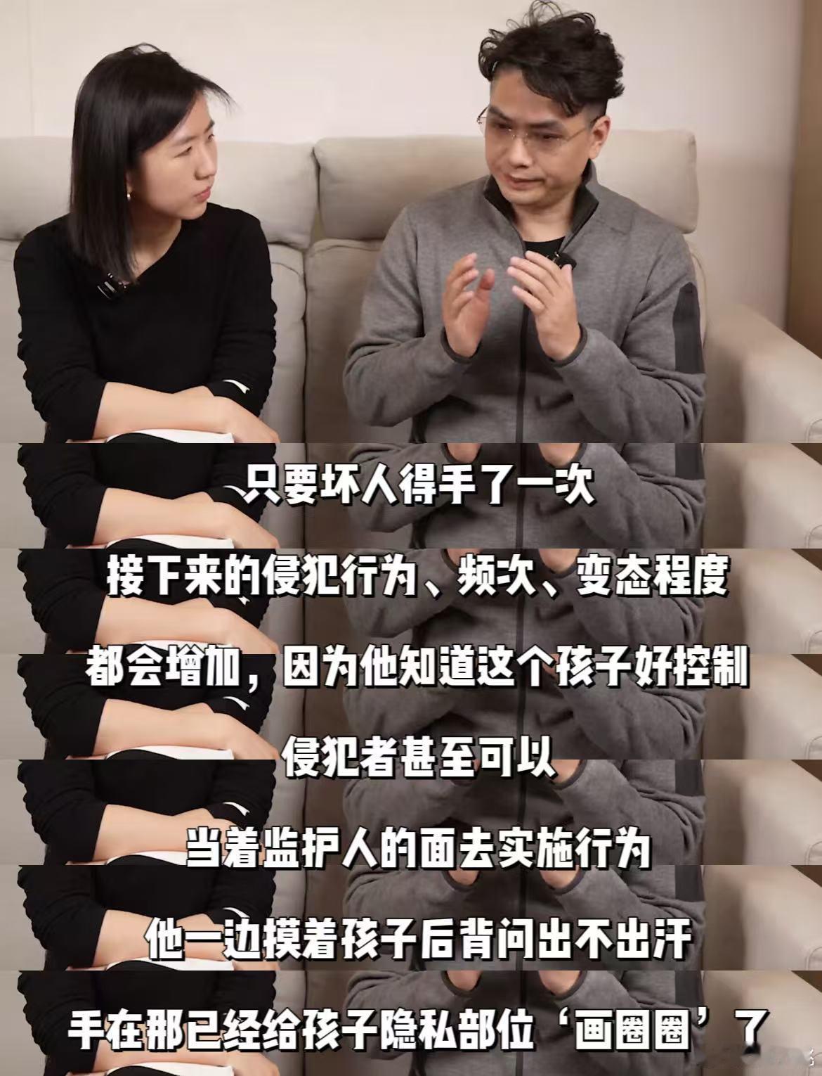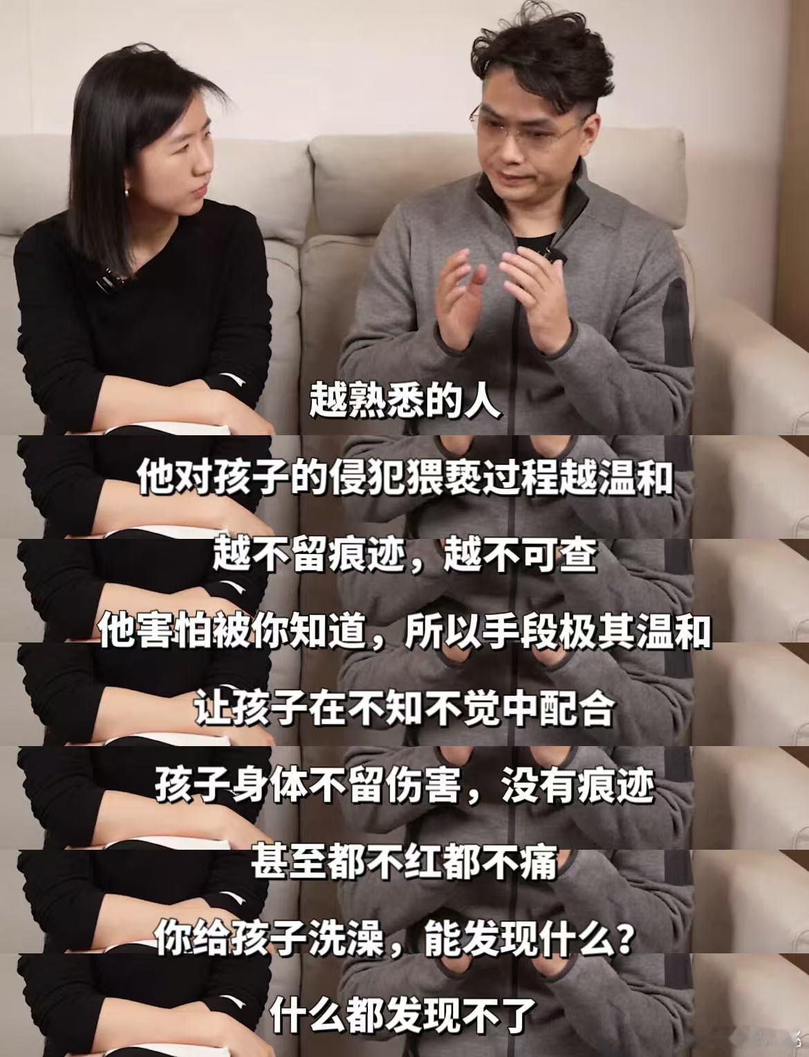 男孩被侵犯4年以为是游戏 终于等到了这期对谈,比我想象的更震撼,也更沉重。 安全官爸爸说了一组数据:他的视频被观看超过4亿次,帮助过10000多个家庭发现孩子被性侵。而这一万多个案例里,超过一半的施害者是近亲——爸爸、爷爷、哥哥、叔叔。 我第一反应是“不可能”,第二反应是“会不会太夸张了”。但他接着说,很多人觉得这种事离自己很远,但那些给他发私信的孩子,那些哭着问“这是爱吗”的孩子,都曾经以为这种事不会发生在自己身上。 我突然想起前几天家庭聚会,爷爷抱着我女儿亲了又亲,我还笑着说“爷爷真疼你”。老公的哥哥逗她玩,把她抱在腿上颠来颠去,我还在旁边拍视频。 如果、万一、假设——我不敢往下想了。那些我以为的“亲情”,在别人家可能就是伤害的开始。我不是要怀疑所有亲人,但我突然意识到,我从来没有教过女儿“什么是可以的,什么是不可以的”。我以为她小,不懂。但其实不懂的是我。
