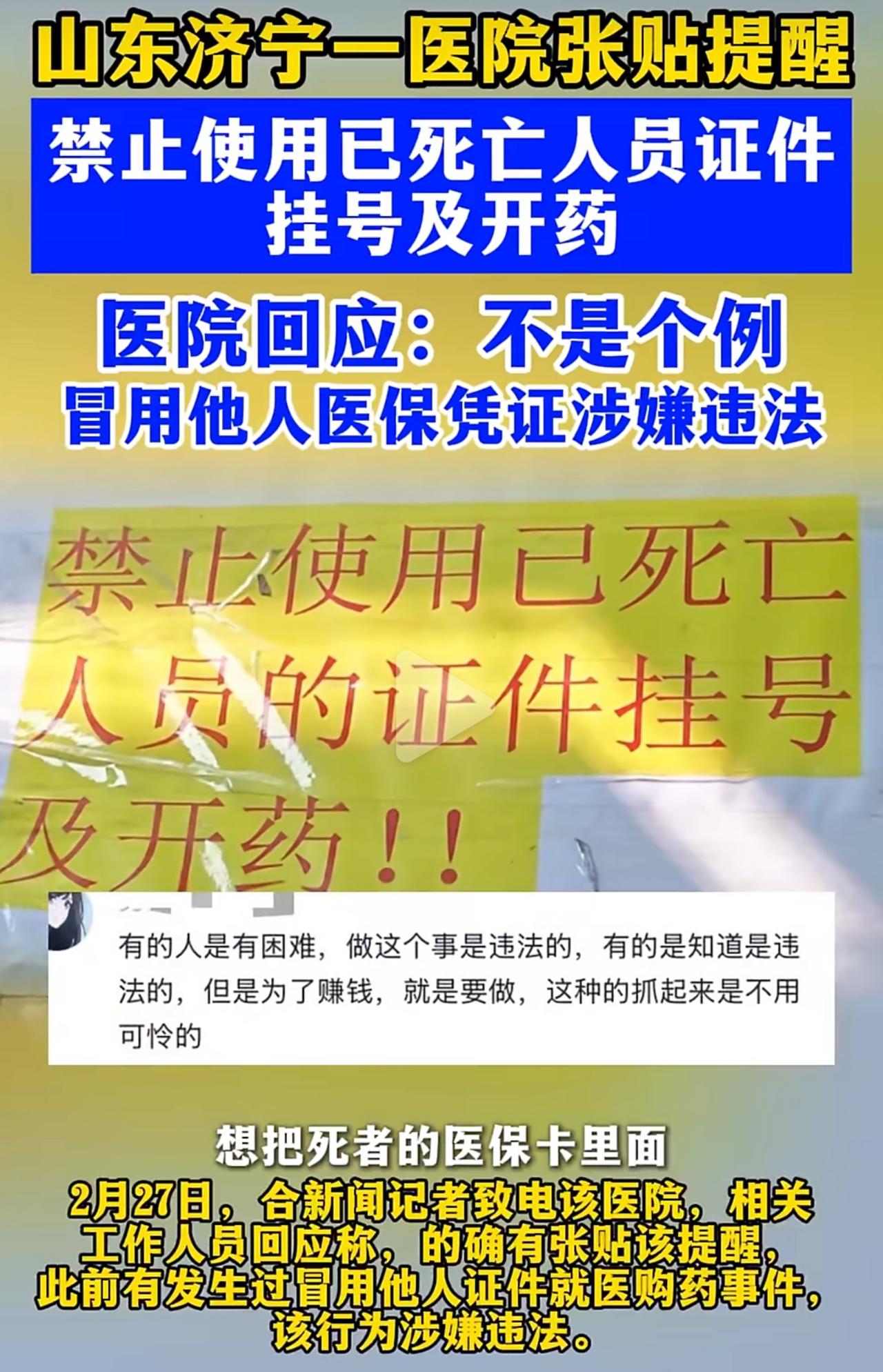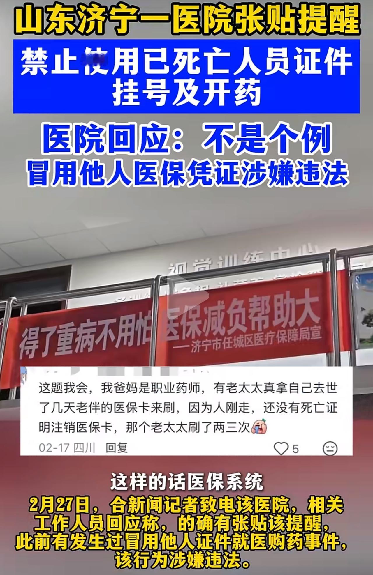 第一眼看到医院贴的提示,直接看愣了:禁止用已经去世的人证件挂号开药。不少人第一反应都是太晦气、不尊重逝者,可了解背后原因,真的笑不出来。 山东济宁这家医院,之所以贴出这么扎眼的通知,是因为真的有人这么干。 总有人拿着过世亲人的身份证、医保卡,来医院开药、刷医保报销,钻系统的空子骗保。有的是没及时注销户口,医保信息没更新;有的就是故意想把卡里的钱花完,根本不管这是违规违法。 医院也是被逼得没办法,不明确提醒,就有人不断来冒名使用。一旦查出来,医院要受罚,医保基金也会白白流失,那可是大家的救命钱。 很多人一开始骂医院操作太极端,等弄明白来龙去脉,全都沉默了。不是医院不近人情,是真有人在钻漏洞、贪小便宜。 这事儿看着离谱,其实特别现实。医保是公共资源,不是谁的私房钱,更不能拿逝者来占便宜。希望系统能早点同步信息,也希望大家守住底线,别做这种既违法又寒心的事。医保骗保 死亡证明 医保卡