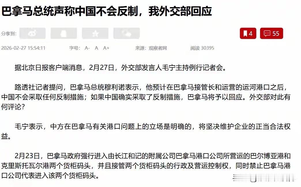 巴拿马总统:预计在巴拿马接管长和运营的运河港口之后,中国不会采取任何反制措施。上述言论是路透社记者提问,巴拿马总统穆利诺说的。这话说得,好像他手里握着什么不得了的王牌似的,透着一股莫名的自信。 首先,这种判断本身就很离谱。中国对于巴拿马这种单方面撕毁合同、公然接管中资企业资产的行为,立场是一贯且明确的:坚决反对,并将采取一切必要措施维护中国企业的合法权益。这不是会不会的问题,而是必须维护国际商业规则和契约精神的原则问题。穆利诺总统似乎误判了形势,也低估了中国维护自身利益的决心。 其次,他可能没搞清楚状况。巴拿马虽然地理位置关键,但在全球经济和国际政治的棋盘上,它有多大资本对一个世界主要经济体说“将予以回应”?这种回应除了进一步损害本国信誉、吓跑更多外资,还能有什么实质作用?这种表态,听起来更像是为了安抚国内某些势力或应对某种外部压力而说的场面话,缺乏现实基础。 有分析认为,巴拿马此次强硬行动,背后很可能有来自美国的压力。穆利诺政府或许是想通过展示对运河区周边战略资产的控制,来换取华盛顿的某些支持。但这种“选边站”和背弃商业契约的做法,无疑是短视的。它牺牲的是国家的长期信誉和投资环境,得罪的是最重要的经贸伙伴之一。 对于这种公然违约的行为,国际社会自有公论。中国企业完全有权通过法律和政治途径维权。中国的反制工具箱里,也从来不缺少合法、合理的选项。穆利诺总统与其揣测中国会不会反制,不如认真思考一下:这种破坏规则的行为,最终会让巴拿马自身付出怎样的代价?真正的智慧,是回到遵守契约、对话协商的正道上来。