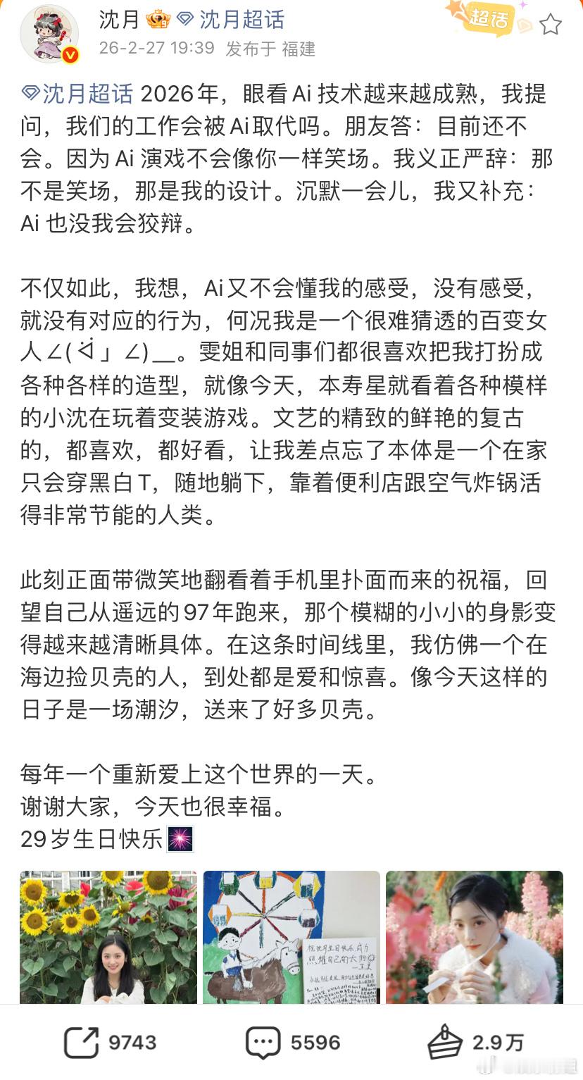 沈月问我们的工作会被AI取代吗朋友答:目前还不会。因为Ai 演戏不会像你一样笑场。我义正严辞:那不是笑场,那是我的设计。沉默一会儿,我又补充:Ai 也没我会狡辩。哈哈哈,太可爱了祝百变的沈月29岁生日快乐,永远做最自由又明媚的自己❤️都去支持沈月的新综艺亲爱的客栈