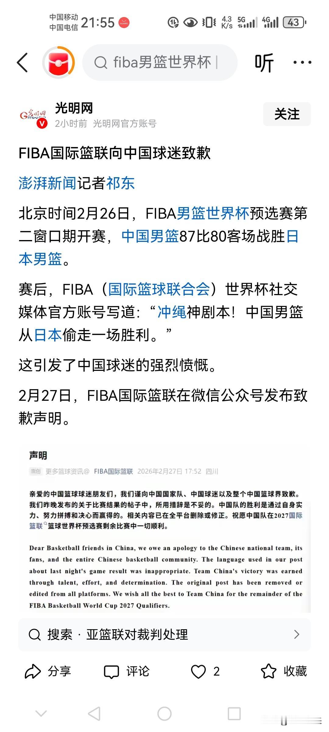 公道自在人心,群众的眼睛是雪亮的 国际男篮FIBA向中国球迷道歉 并且在中国