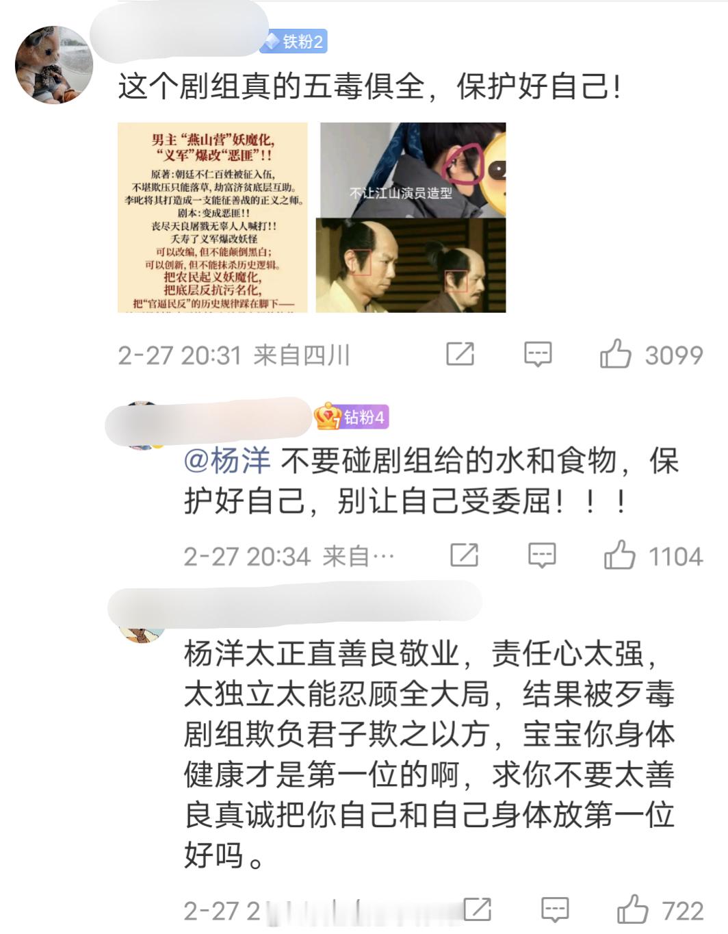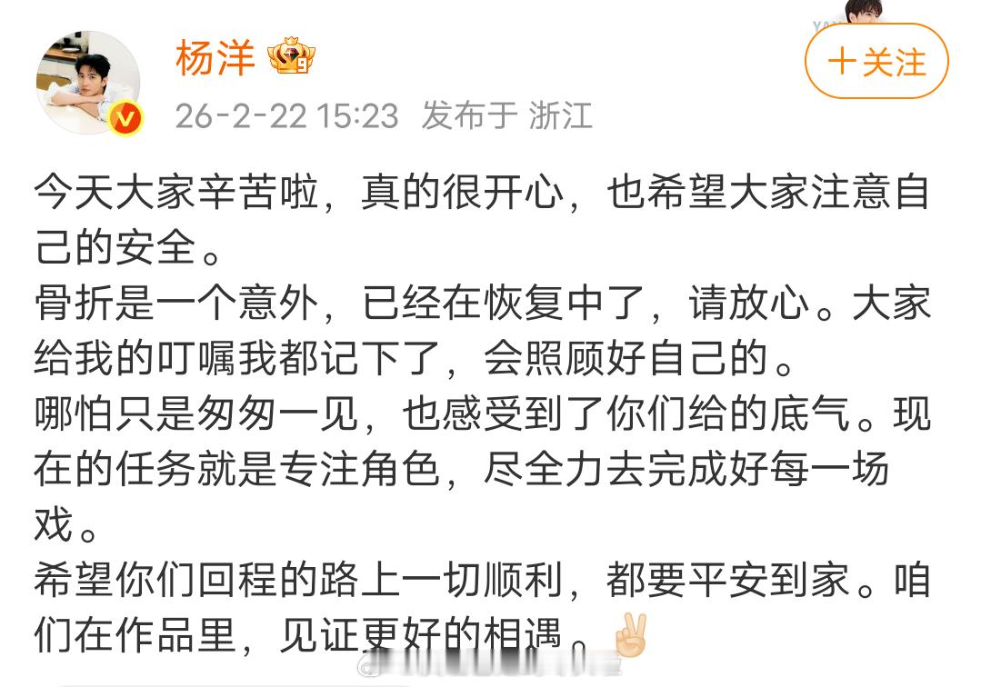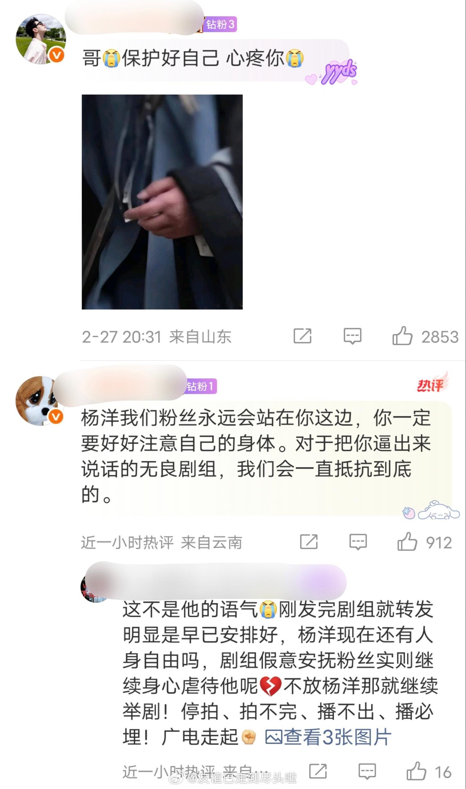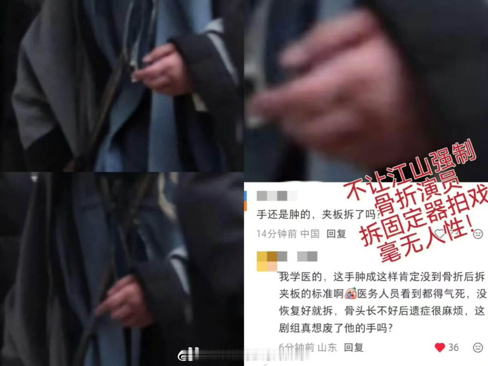 杨洋两次发博解释骨折是意外,强调去年底手部意外受伤,让粉丝爱剧护剧,不信谣不传谣。评论区粉丝依然在维权,让杨洋保护好自己,不要碰剧组给的水和食物。因为杨洋手部异常肿胀,还质疑是不是为了赶进度拆掉了固定器?粉丝对《不让江山》剧本和妆造不满意可以发声,但现在感觉舆论发酵得有些过头了,下沉市场都不知道传成什么样了杨洋发文回应不让江山争议杨洋的手好肿 杨洋不让江山造型路透