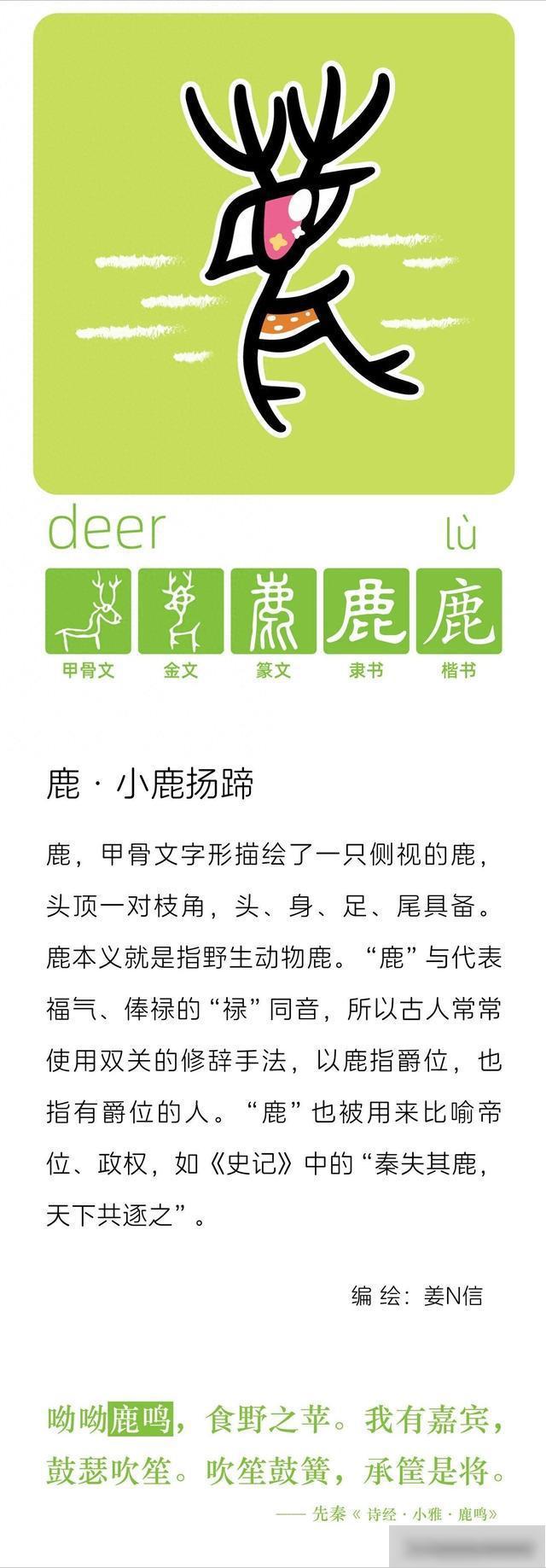 鹿,甲骨文字形描绘了一只侧视的鹿,头顶一对枝角,头、身、足、尾具备。鹿本义就是指野生动物鹿。“鹿”与代表福气、俸禄的“禄”同音,所以古人常常使用双关的修辞手法,以鹿指爵位,也指有爵位的人。“鹿”也被用来比喻帝位、政权,如《史记》中的“秦失其鹿,天下共逐之”。