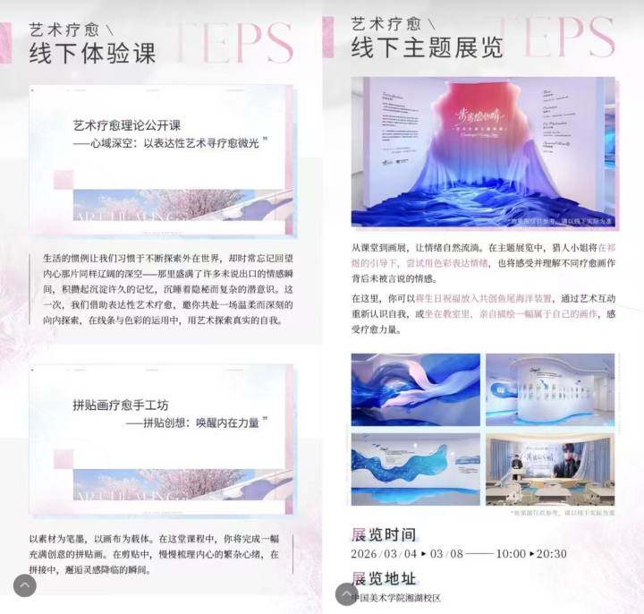 此外,本次联动打造了线上线下多形式的活动内容,除已上线的线上先导课程外,还设置了线下体验课程,参与者可在现场专业指导下完成艺术创作;同时还将配套举办艺术疗愈主题的线下展览。