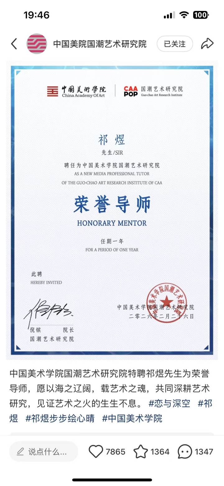 据了解,祁煜担任荣誉导师的中国美术学院国潮艺术研究院成立于2021年。院长为倪镔教授,其曾任《仙途》艺术总监,参与《深海》《大鱼海棠2》动画概念设计。在此次活动中,中国美术学院国潮艺术研究院也表示:“愿以海之辽阔,载艺术之魂,共同深耕艺术研究,见证艺术之火的生生不息。”