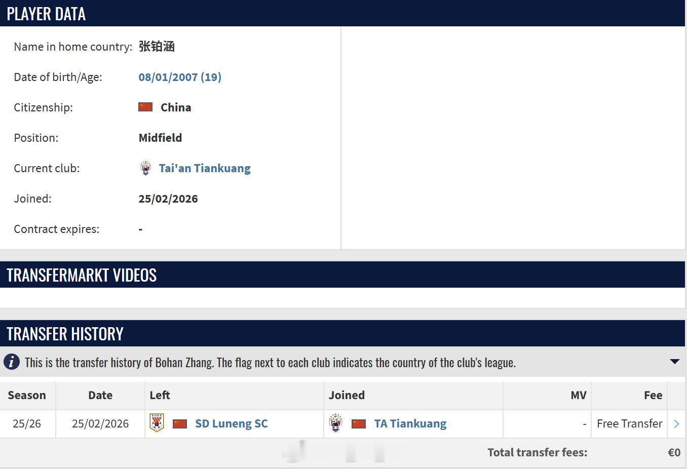 据德转消息,山东鲁能泰山足球学校张铂涵免签加盟泰安天贶自由橙山东泰山