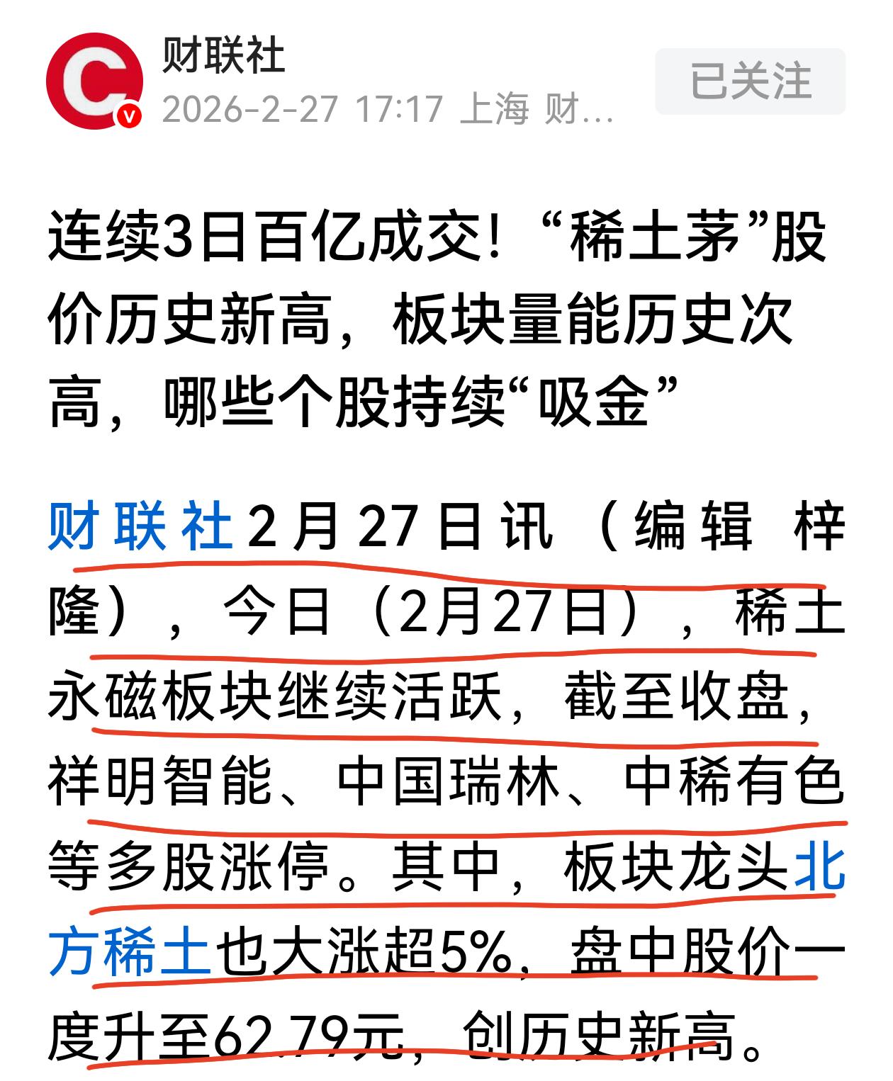 部分老美的航天和半导体企业没办法接单了,不是产能不够,而是缺乏关键材料“稀土”,不是没钱买,而是有钱也不一定买得到,关键是这种阵痛才刚刚开始。 没有了“钇”,发动机和涡轮机的高温涂层就做不出来,没有定期涂抹这些涂层,发动机就没法运转;没有了“钪”,先进芯片的处理和封装就遇到难题,“钪”还在燃料电池、特种铝质航空合金发挥极为重要的作用。 去年11月以来,国际市场上钇的价格已累计上涨了约60%,价格约是一年前的69倍。这些稀土的用量不大,但不能没有,所以价格不成问题,关键是买不到,这就是稀土的战略价值,也是稀土股创新高的底气。 近几天稀土再度活跃,板块连续3日100亿成交,头部企业股价创出了历史新高。稀土不是土,是战略资源,其价值正不断被认识和发掘。但有涨必有跌,涨多了就会调整,这是资本市场的常识,所以追高存在短期风险,看好也得逢低介入才稳妥。