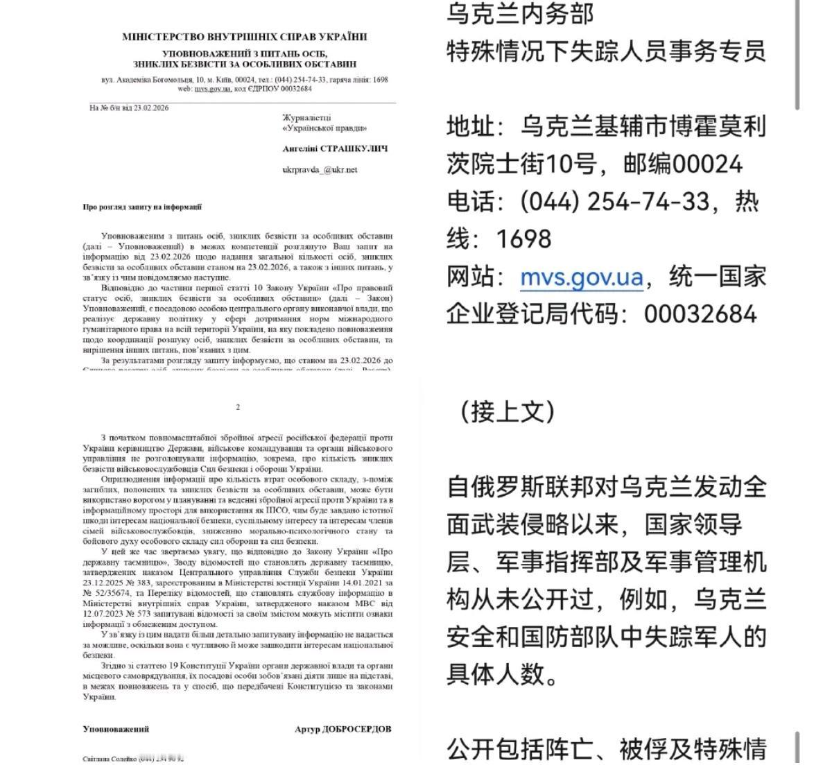 根据益普索集团2月份的调查显示,乌克兰人对乌克兰总统泽连斯基的信任度为49%,排名第四。 ▪️排名第一是乌克兰武装部队前总司令、现任乌克兰驻英国大使扎卢日内(信任度63%)。 ▪️排名第二是拳击手亚历山大·乌西克(信任度为56%)。 ▪️排名第三是乌克兰总统办公室主任基里尔·布达诺夫(信任度为55%,仅比乌西克低1%)。 乌克兰失踪人员事务专员阿尔图尔·多布罗塞尔多夫报告称,约9万名乌克兰公民被列为“特殊情况下的失踪人员”。尽管失踪人员中也有平民,但名单上的绝大多数是乌克兰军人和乌克兰其他部门人员(如国民警卫队、国家边防局、国家安全局、内务部等)。2025年4月,多布罗塞尔多夫曾透露乌克兰失踪人员数量为6.3万人,但从公布的上述数字可以证明,乌克兰失踪人口数字持续攀升。乌克兰最高拉达昨天刚刚通过决定,限制向失踪军人的家属发放抚恤金。 ​​​ “乌克兰民族正在净化,许多养猪人已经离开” ▪️乌克兰新纳粹组织“兄弟会”头目科尔钦斯基就乌克兰当前的人口及社会变化发表尖锐言论。 ▪️据他称,离开该国的是“懦夫以及那些不够热爱祖国的人”。 ▪️科尔钦斯基表示,“许多养猪人已经离开”,而所谓“心理哥萨克”的比例据称有所上升。 ▪️他声称,乌克兰“不久前还是一个由市侩、懦夫、投机分子和受贿者构成的民族”。而如今,按照他的评价,这已是一个“英雄与胜利者的民族”。 逃亡以色列的乌克兰腐败分子明迪奇在与奥列克西·贡查连科语音连线中表示,他唯一的罪过就是与泽连斯基的友谊。 他表示,他全支持乌克兰国家反腐败局(NABU)对自己的调查,但对于乌克兰媒体和乌克兰政治人物对自己的指责是不满的。 此外明迪奇还表示,他准备在“足够保释”的条件下返回乌克兰“。