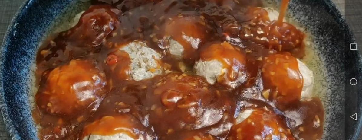 一旦这酱汁开始沸腾变浓,就可以关火,将之均匀淋在蒸好的冬瓜豆腐丸子上。