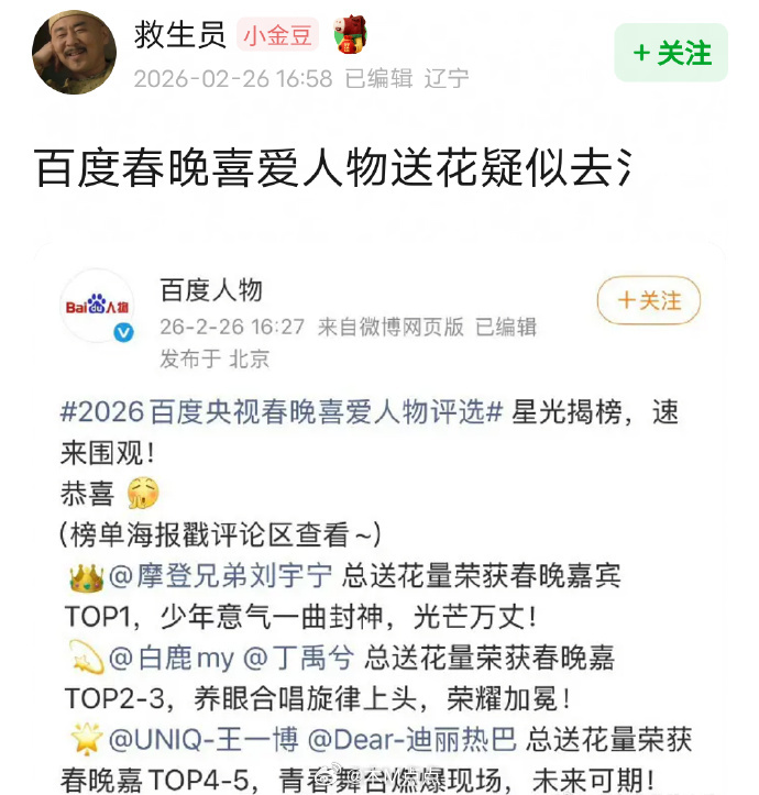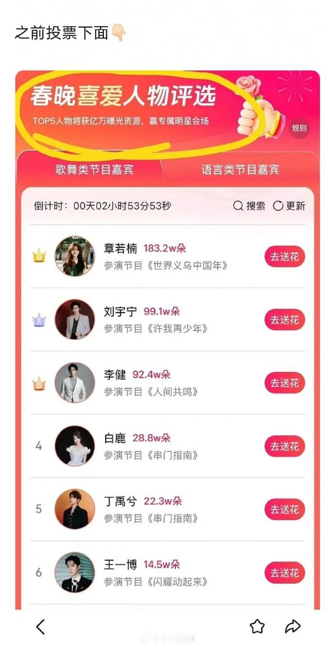 百度春晚喜爱人物评选清水了清水后第一名刘宇宁、第二名白鹿、第三名丁禹兮清水前第一名章若楠、第二名李健、第三名刘宇宁
