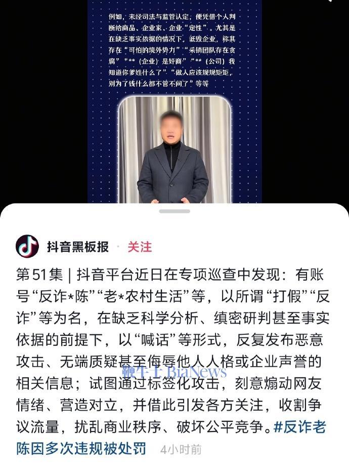 官方称,抖音平台近日在专项巡查中发现,有账号“反诈*陈”“老*农村生活”等,以所谓“打假”“反诈”等为名,在缺乏科学分析、缜密研判甚至事实依据的前提下,以“喊话”等形式,反复发布恶意攻击、无端质疑。甚至发布侮辱他人人格或企业声誉的相关信息,试图通过标签化攻击,刻意煽动网友情绪、营造对立,并借此引发各方关注,收割争议流量,扰乱商业秩序、破坏公平竞争。