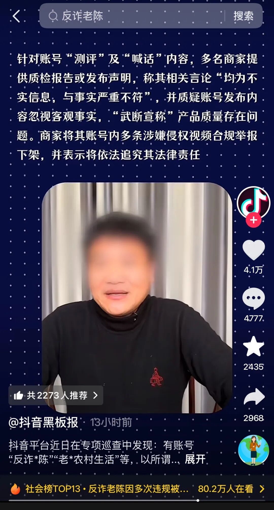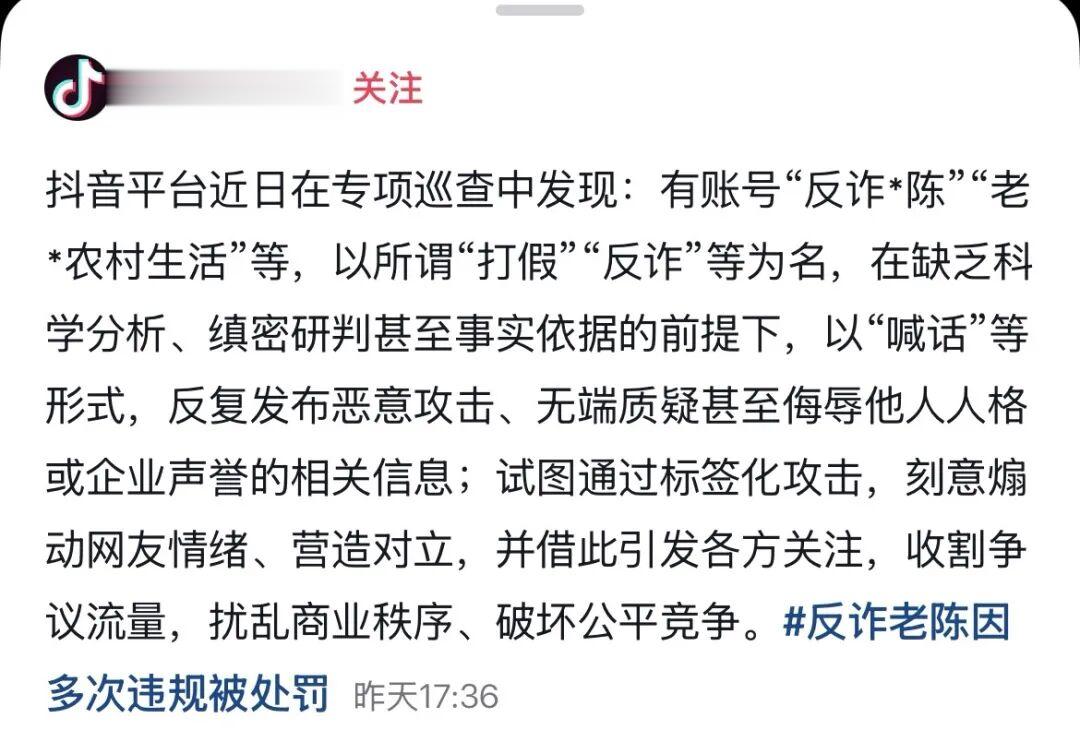 有账号“反诈*陈”“老*农村生活”等,以所谓“打假”“反诈”等为名,在缺乏科学分析、缜密研判甚至事实依据的前提下,以“喊话”等形式,反复发布恶意攻击、无端质疑甚至发布侮辱他人人格或企业声誉的相关信息,试图通过标签化攻击,刻意煽动网友情绪、营造对立,并借此引发各方关注,收割争议流量,扰乱商业秩序、破坏公平竞争。