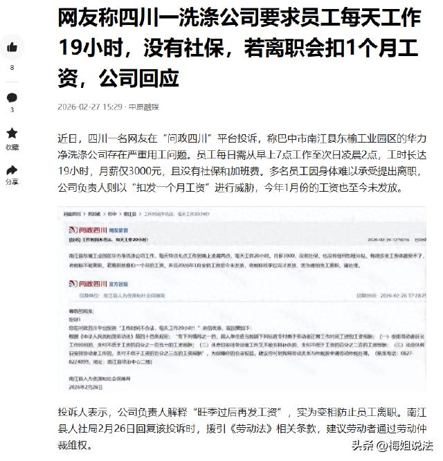 四川,一女子在某洗涤公司上班,每天从早7点忙到下半夜2点,工作19小时,累得够呛,每月就3000元工资,公司还不给交社保。女子想辞职,公司却称离职扣1个月工资,甚至2026年1月的工资都拖着不发,老板还放话旺季过完才发,走了就别想要。此事曝光后大家纷纷指责公司,这公司严重违反劳动法规,希望相关部门能介入,帮女子讨回公道。 2026年1月的工资,至今没到账。 女子找老板要过一次,老板头都没抬,只丢了一句,旺季没过,急什么。 再问,就翻了脸,说想走可以,1月份工资别要,还要扣掉上个月的工资当违约金。 谁能想到,这份熬人的工作,连基本的保障都没有。 女子每天凌晨就得起床,天还没亮,窗外都是黑的。简单洗漱,啃两口馒头,就往公司赶。 7点必须打卡,晚一分钟都要被说。 洗涤公司的活,没什么技术含量,全是力气活。 搬不完的布草,洗不完的衣物,水是凉的,手泡得发白起皱。 从早上7点,一直干到下半夜2点,中间就只有吃饭的十几分钟,连喝口水的功夫都得挤。 一天下来,浑身酸痛,连抬手的力气都没有。 就这,一个月才3000块。没有绩效,没有补贴,连最基本的社保都没有。 女子不是没忍过,想着多干点,老板能看在眼里,哪怕涨一点工资,或者补上社保也行。 可忍了大半年,什么都没有。 身体倒是越来越差,经常熬夜熬到头晕,有时候站着都能晃一下。 实在撑不住了,才鼓起勇气提辞职。 女子以为,好聚好散,自己干了这么久,至少能拿到应得的工资。 没想到,老板直接翻脸。 说女子没干满一年,辞职就是违约,必须扣一个月工资。 还说1月份的工资,要等旺季结束,也就是三个月后才发。 女子急了,跟老板争辩。 老板更横,放话说,走可以,工资一分没有,不服就去告,我奉陪到底。 女子没什么文化,也不知道该找谁求助,只能偷偷哭,觉得自己太冤了。 后来,身边的同事看不下去,让女子把事情曝光。 女子犹豫了很久,怕被老板报复,但想到自己的工资,还是把自己的经历说了出来。 事情一曝光,瞬间网友们的评论热闹了起来。 大家都在骂这家公司黑心,欺负打工人。 有人说,每天19小时,这根本不是上班,是压榨。 其实很多打工人都有过类似的经历,怕丢工作,不敢反抗,任由老板欺负。 可这样的纵容,只会让老板更肆无忌惮。 公司这么做,真的合法吗?女子的工资能要回来吗?辞职被扣工资,到底合理不合理? 根据《劳动法》第36条规定,劳动者每日工作时间不超过八小时、平均每周工作时间不超过四十四小时的工时制度。 女子每天工作19小时,远远超过了法定的8小时,就算是加班,每天也不能超过3小时,每月不能超过36小时。 公司这种做法,已经严重违反了劳动法。 据《工资支付暂行规定》第7条规定,工资必须在用人单位与劳动者约定的日期支付,至少每月支付一次。 公司拖欠2026年1月的工资,还说旺季过完再发,这已经构成了无故拖欠工资。 工资支付暂行规定第15条,除了法定的几种情况,用人单位不得克扣劳动者工资。 女子正常辞职,公司没有任何理由扣她一个月工资,这种规定本身就是无效的。 依据《劳动法》第72条规定,用人单位和劳动者必须依法参加社会保险,缴纳社会保险费。 公司不给女子交社保,也是违法行为,女子可以要求公司补缴。 女子只要收集好自己的打卡记录、工作记录、和老板的聊天记录,证明自己在公司工作,以及公司拖欠工资、不缴社保、强制加班的事实,去劳动监察部门投诉,或者申请劳动仲裁,肯定能赢。 公司不仅要足额支付拖欠的工资,还要支付加班工资,补缴社保,甚至可能会被劳动部门罚款。 打工人被恶意压榨,合法权益被侵犯。 很多打工人因为不懂法,或者怕麻烦,选择忍气吞声,反而助长了不良老板的气焰。 其实,打工人的权益,是受法律保护的。 目前,这件事还没有最终的处理结果,相关部门也还没有正式介入。 大家觉得,这家公司应该受到什么样的处罚?女子能顺利要回自己的工资和社保吗?如果是你遇到这种情况,会选择忍气吞声还是坚决维权?