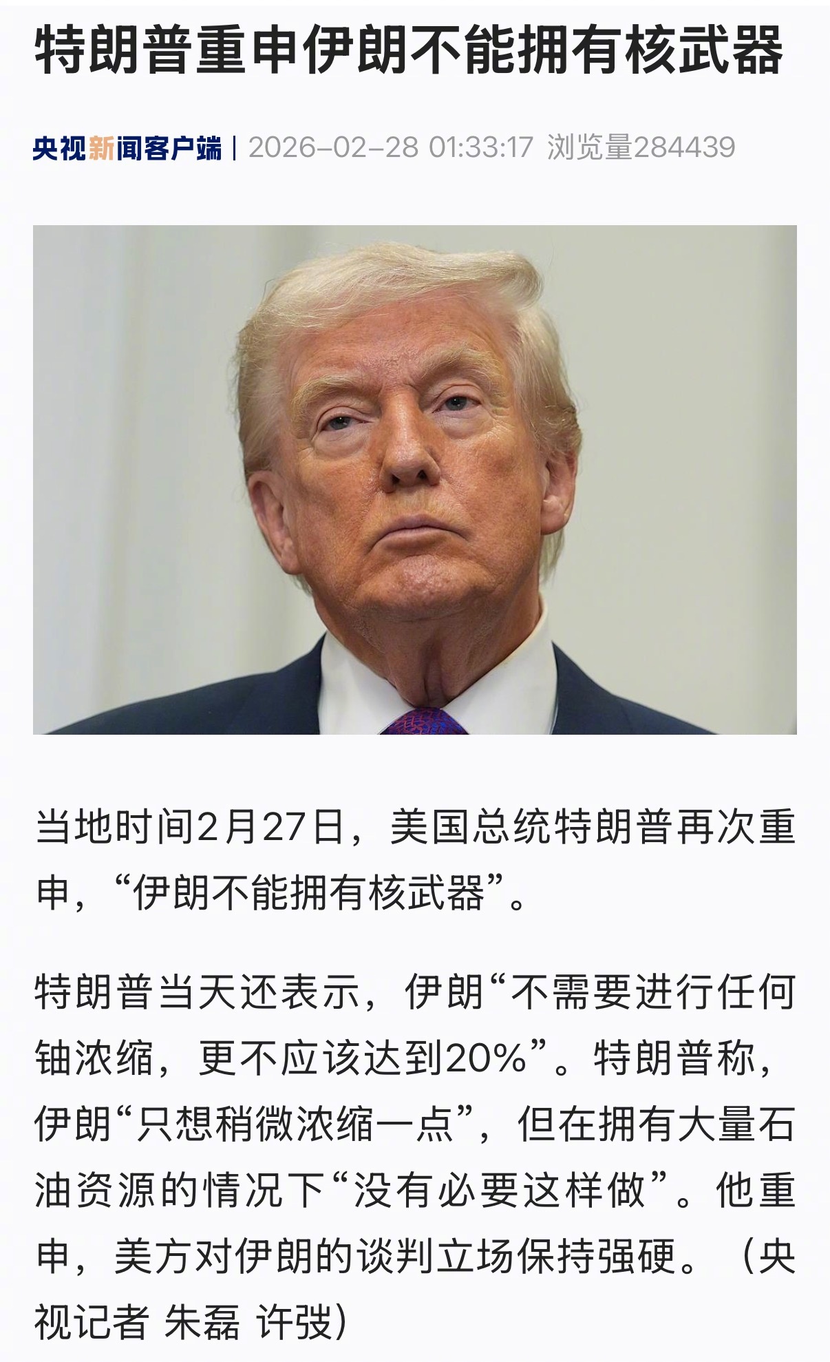 【#特朗普重申伊朗不能拥有核武器# 】当地时间2月27日,美国总统特朗普再次重申,“伊朗不能拥有核武器”。