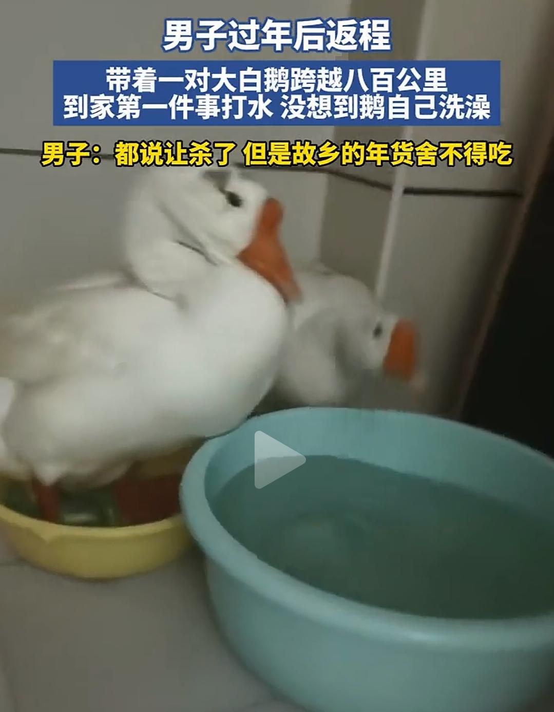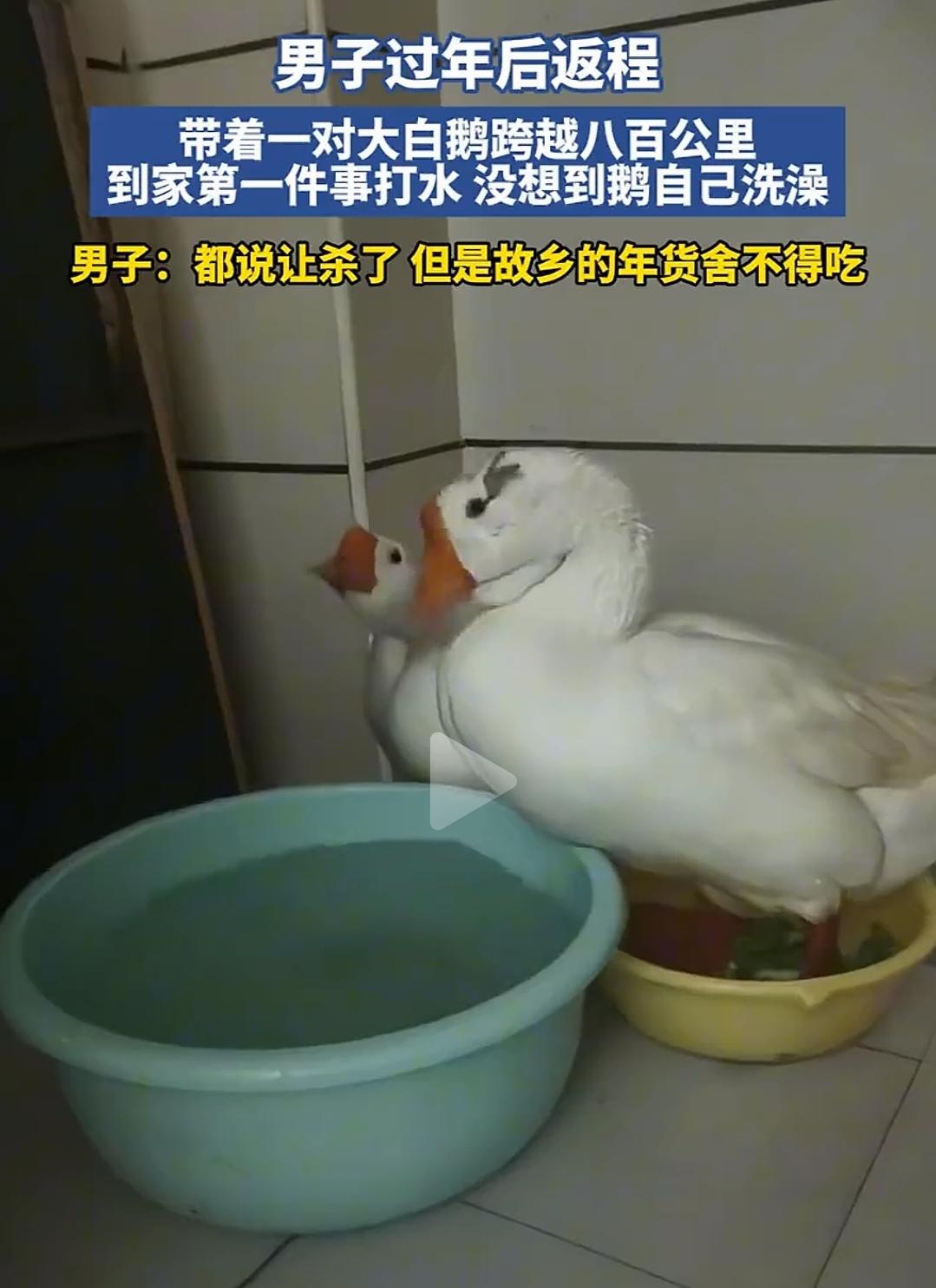 800公里回程旅途一路相伴,没想到竟然与两只不会说话的大白鹅处出了感情。 2月26日,一位网友发布的一段视频 ,打动了无数人。 视频内容显示 ,男子回家过年返程时带回来两只大白鹅。800公里的返程旅途,两只大白鹅一路默默相伴。 到家后,男子打来一盆水,两只大白鹅好像心领神会一样,居然自己洗起澡来。那娴熟的动作,让男子感到亲切而又温暖,并觉得两只大白鹅越看越可爱。 家人和邻居都建议将这两只大白鹅杀掉,养着很麻烦也不卫生。可是男子却舍不得,觉得这是家乡带来的年货,有这么可爱, 值得被善待。 是呀,两只大白鹅陪伴800公里来到新家,他们当然不懂人类的感情。但是对身处异乡的游子而言,这两只大白鹅不只是家禽,同时也是绵绵乡愁的载体。 之前看过类似的新闻。一位网友返程时从家乡带回三只鸭子,舍不得宰杀,放养在小区的池塘里,供小区的孩子们观赏。 物业公司觉得这是一件好事,还专门在池塘边搭建了一个小棚子,供几只鸭子休息。也就是从那时起,这个小区又多了一处风景。 很多在外的游子都知道,乡愁是一种说不清道不明的情感,深深扎根在我们的内心。有时候,故乡的一草一木都可以深深触动我们,让我们泪流满面。