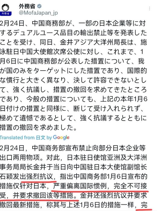日本出来回应了!在我们将20家日本实体纳入管制清单之后,日本非常的愤怒!2月24日,日本外务省发表声明声称,中国商务部宣布对部分日本企业等实施两用物项出口禁令,日本已经对中国驻日本大使馆公使提出交涉。此前,针对中国商务部1月6日公布的相关措施,日本方面已明确表示:该措施仅以日本为对象,与国际通行惯例严重不符,绝对无法接受,并已提出强烈抗议,要求中方撤销相关措施。 最近几天,日本方面急眼了,原因很简单,咱们中国商务部出手,把20家日本实体纳入了出口管制清单,这一下就戳中了日本的痛处,愤怒的表态接二连三。 最新的动静是2月24号,日本外务省特意发了声明,语气里满是不满,说中国对部分日本企业实施两用物项出口禁令,他们已经正式向中国驻日本大使馆的公使提出了交涉,说白了就是上门“讨说法”。 这已经不是日本第一次抗议了,早在1月6号,咱们商务部刚公布相关管制措施的时候,日本就已经跳出来表态了。 当时日本方面说得特别硬气,声称中方的措施只针对日本,和国际上通行的惯例严重不符,还说“绝对无法接受”,一边强烈抗议,一边要求中方赶紧撤销相关措施。 说真的,这话听着就有点双标,毕竟国际上各国出于自身安全考虑,实施出口管制是很常见的事,怎么到了中国这里,就成了“不符合惯例”了? 先跟大家说清楚,咱们这次管制的是“两用物项”,其实就是那些既有民用用途,又能用于军事,或者能帮助提升军事实力的货物、技术和服务,比如一些精密设备、特种材料之类的,可不是随便什么普通商品。 咱们这次纳入管制清单的20家日本实体,也不是随便选的,都是参与提升日本军事实力的企业和机构,比如三菱造船株式会社就赫然在列。 除了这20家管控名单,当天咱们还公布了另一份关注名单,把斯巴鲁株式会社等20家无法核实两用物项最终用途的日本实体加了进去,对它们的出口审查会更严格,就是怕这些东西被用到不该用的地方。 日本之所以这么愤怒,核心原因其实很简单,就是咱们的管制措施,直接影响到了他们的相关企业和军事发展计划。 要知道,日本这些年一直在推进“再军事化”,还隐隐有拥核的企图,而咱们的两用物项,恰恰是他们提升军事实力所需要的,现在被管制了,相当于断了一部分“后路”,能不着急吗? 咱们这么做目的就是制止日本的“再军事化”和拥核企图,维护咱们自己的国家安全,还有地区和国际的和平稳定,完全是正当、合理、合法的,一点问题都没有。 而且日本说咱们的措施“不符合国际惯例”,纯属自欺欺人。国际上,包括日本自己在内,都有类似的出口管制措施。 就拿日本来说,2023年他们就修订了相关法律,把23种半导体制造设备纳入出口管制,专门限制对中国的出口,当时怎么不说自己不符合惯例?现在轮到自己被管制,就急得跳脚,这双标玩得也太明显了。 还有一点要说明,咱们的管制措施,只针对这40家日本实体(20家管控+20家关注),也只针对两用物项,根本不影响中日之间正常的经贸往来。 那些诚信守法、不涉及军事用途的日本企业,完全不用瞎担心,该合作还是能合作,咱们没打算搞“一刀切”。 日本现在一边抗议,一边上门交涉,其实就是想逼咱们让步,但这显然是不可能的。咱们的措施,是基于自身安全和国际义务做出的决定,合法合规,有理有据,怎么可能因为日本的几句抗议就撤销? 说句实在的,日本与其在这里愤怒抗议、上门交涉,不如好好反思一下自己的行为。这些年,日本一味跟着美国走,不断收紧对华技术出口,还大肆推进“再军事化”,破坏地区和平稳定,咱们的管制,不过是正当的反制和防范。 最后也想说一句,中国从来不会主动挑起争端,但也绝对不会任由别人损害自己的国家安全。 这次对日本实体的管制,就是一个明确的信号:任何国家,只要敢危害中国的安全和利益,咱们都会依法采取措施,绝不手软! 对于此事,大家有什么看法呢?欢迎在评论区留言讨论!