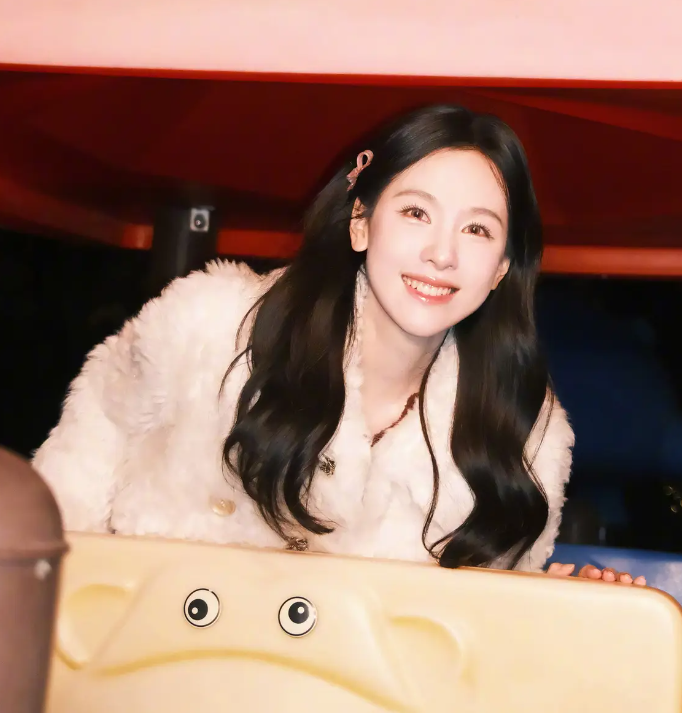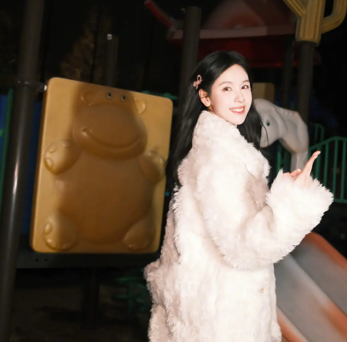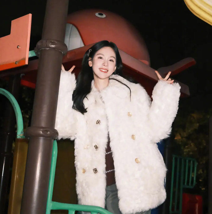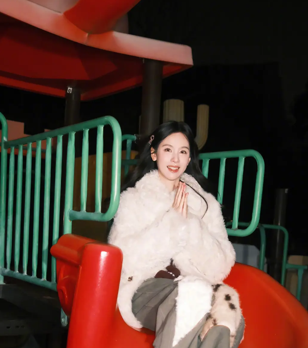 陈都灵双手比耶坐在滑梯上玩耍 笑容清甜明媚又娇俏
