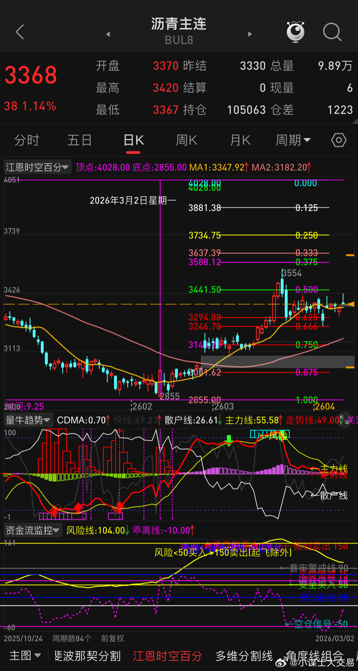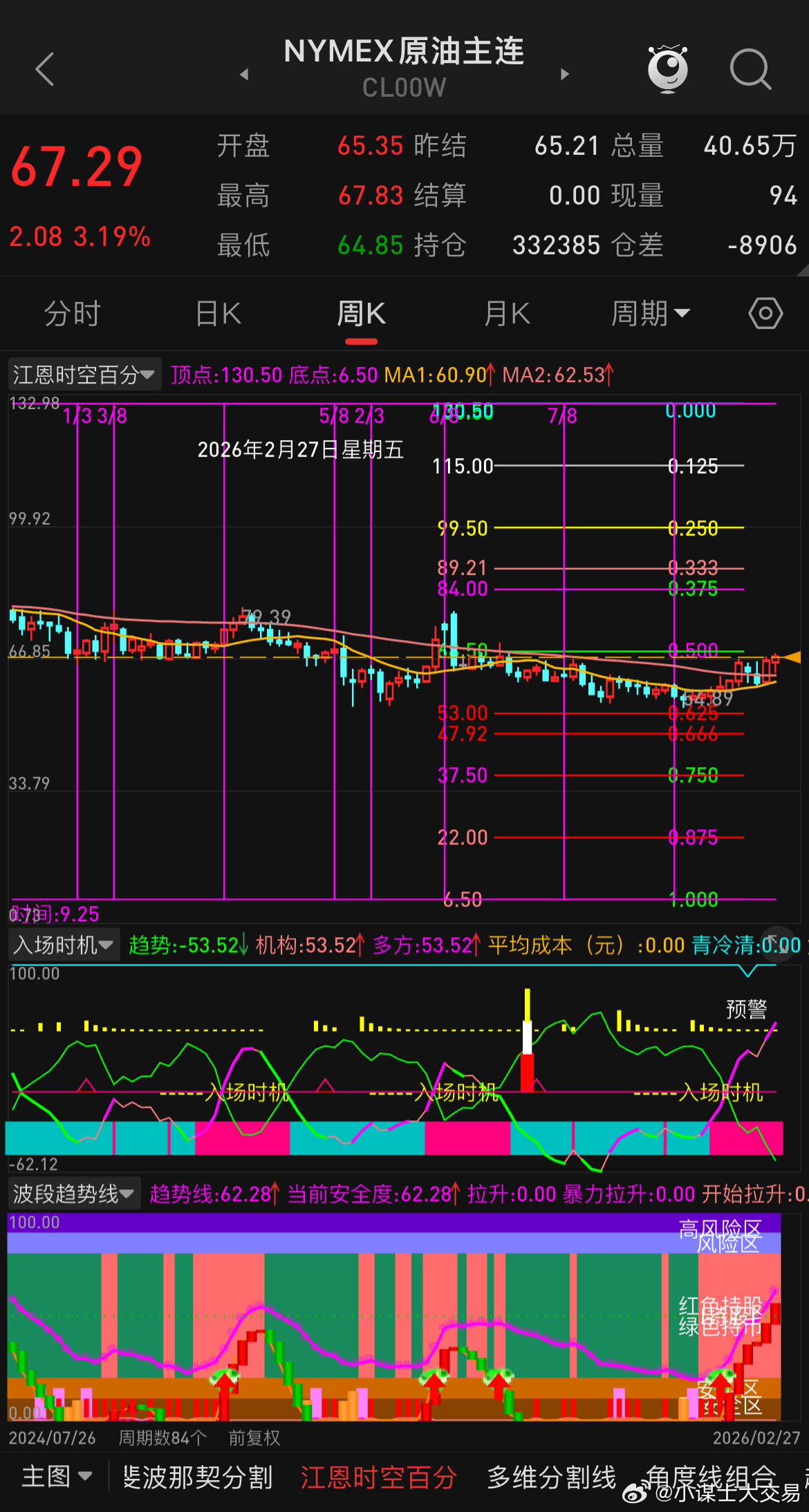 油价年前就有给过67.5-68.5区域的预期,拖到年后才慢慢给出来,当下市场仍是美伊是否开打为变数,加之金银为首的金属类品种巨高不下,尽可能先不要动仓位,高空与追涨都不太合适,看都会吧,就是看,打死不动,不动你就不会亏钱当然也不会赚钱,管不住手的那就另说,市场没大家想的那么美好,少拿自己的血汗钱去挑战这个市场。