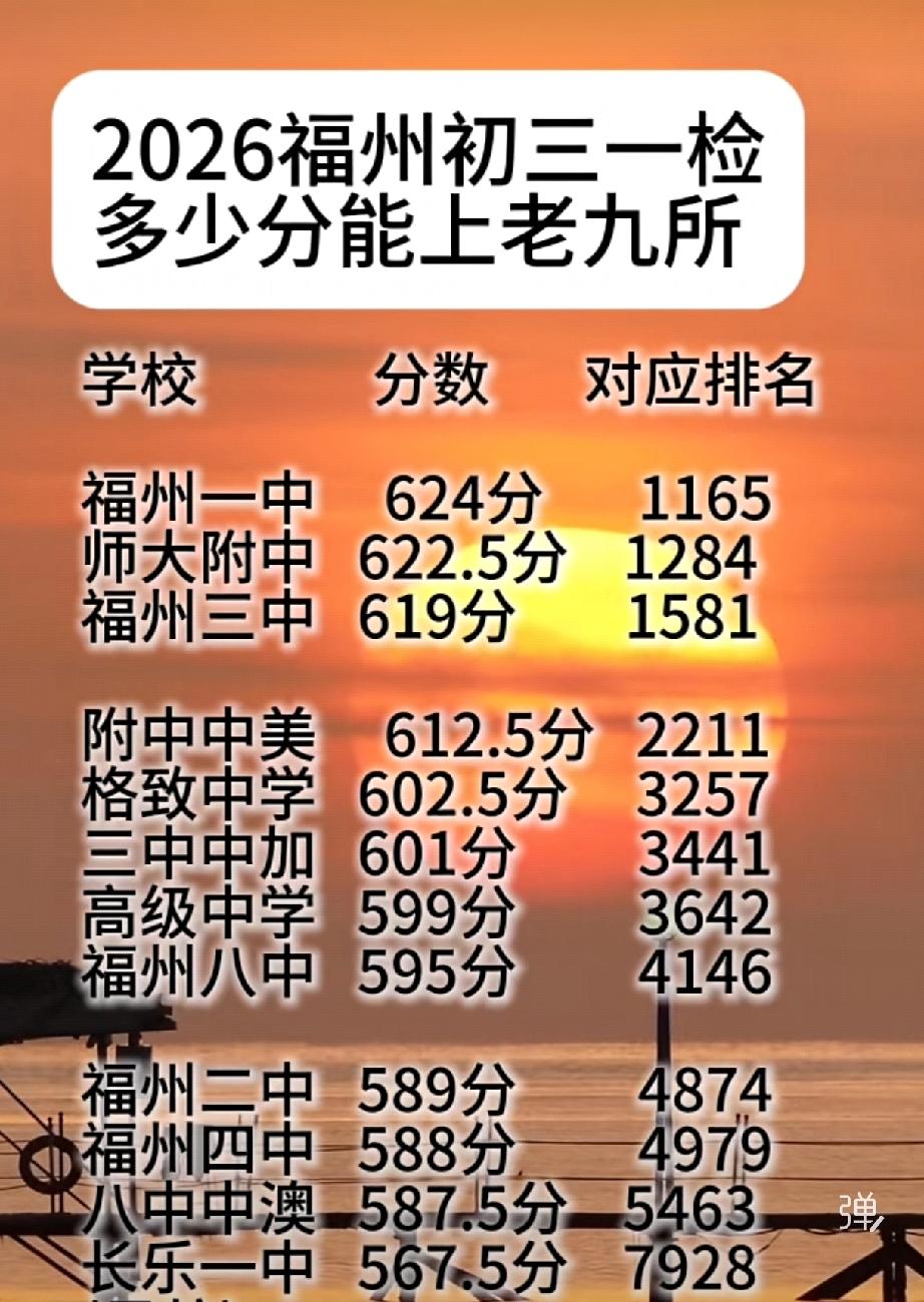 福州一检分数线预测出炉!631分,595分,338分,三条线定位你的高中所在!2026福州初三一检多少分能上老九所?多少分上普高? [赞]第一条投档线(也就是“截胡线”)预测:2025年切在中考排名528名,对应2026年一检分数631分(考虑剔除自招,预估大约在627分),这条线上下的考生基本就是福州一中、师大附中生源。 [加一]第二条投档线(也就是“高保线”)预测:去年切在3893名,对应2026年一检分数595分(剔除自招,估590分),这条线是高分保护线,线上考生基本能定位老九所。 [加一]普高最低投档控制预测:一检分数338分左右(已剔除自招),是初三毕业生进入福州普通高中的最低要求。 [给力]福州六城区参加“一检”的考生共计44289人,加上往届、回原籍的,约4.5万人参加2026中考。考生(家长)要学会使用福州教育局公布的五分段排位表进行自我定位来自找差距,积极努力做好中考备战! 福州初中升学率 福州初三一检卷 福州一检排名 福州高中录取线 福州初三试卷 福州英语一检 福州中考 实时更新福州教育资讯,收藏并关注