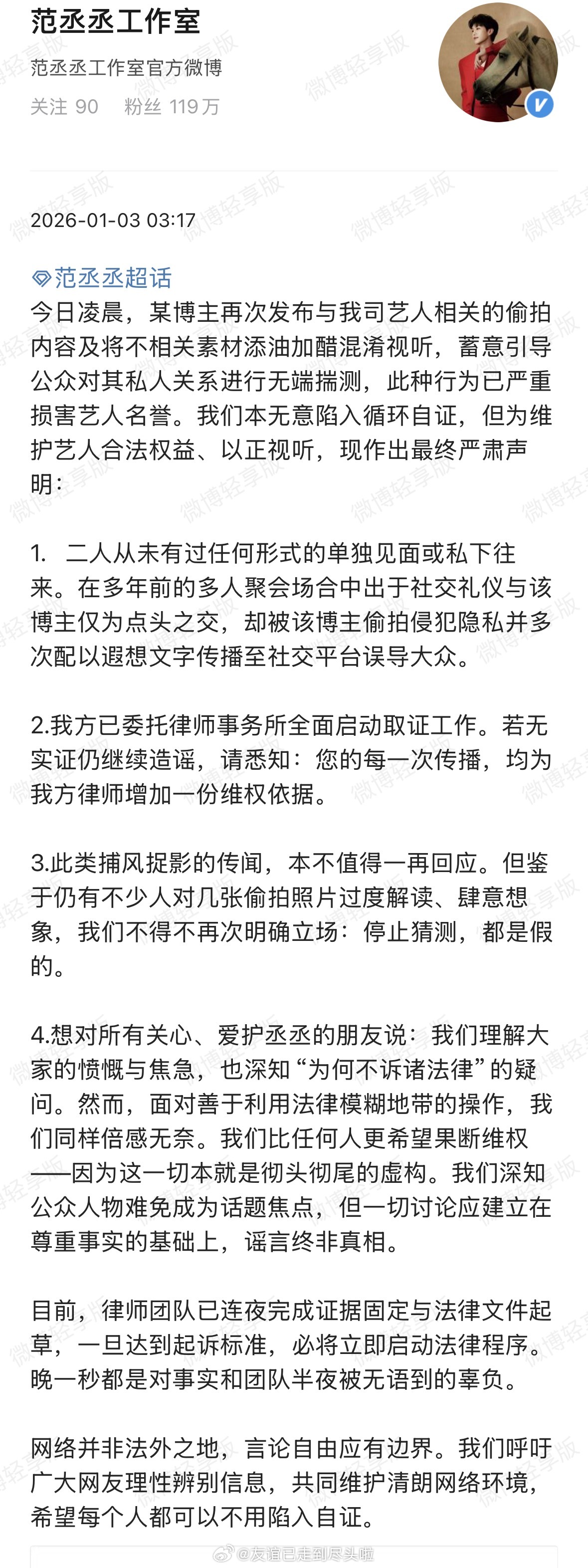 开年两个月,范丞丞工作室两次的深夜辟谣范丞丞方说不认识没交集