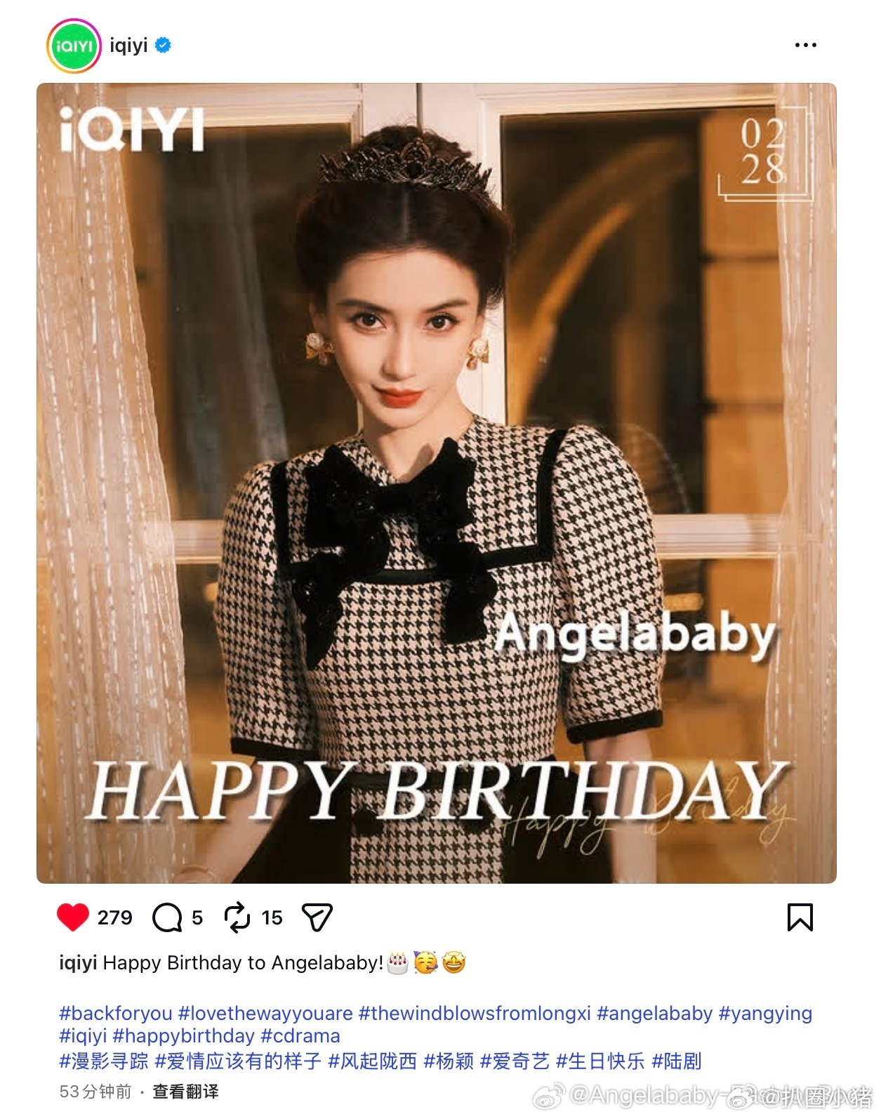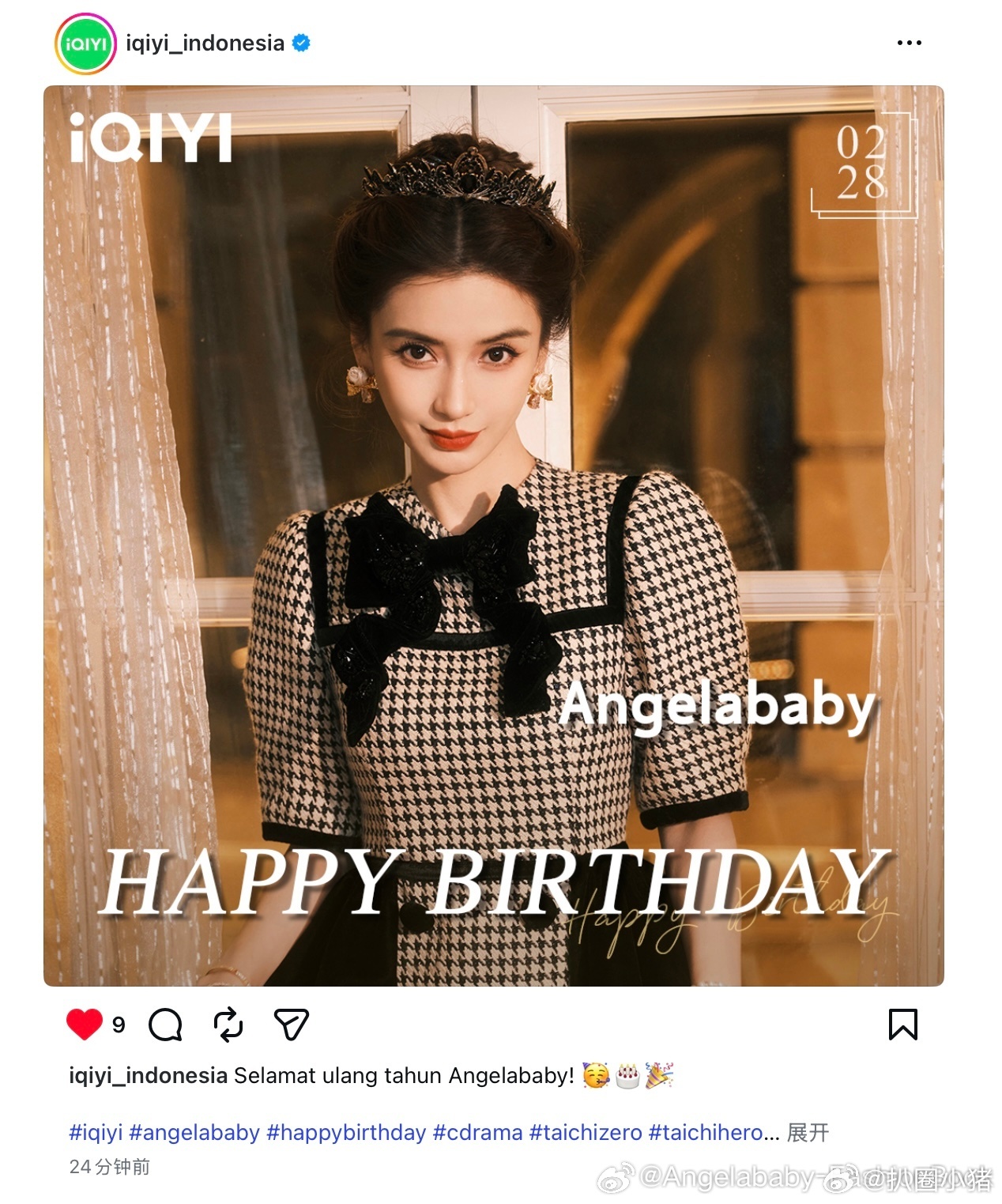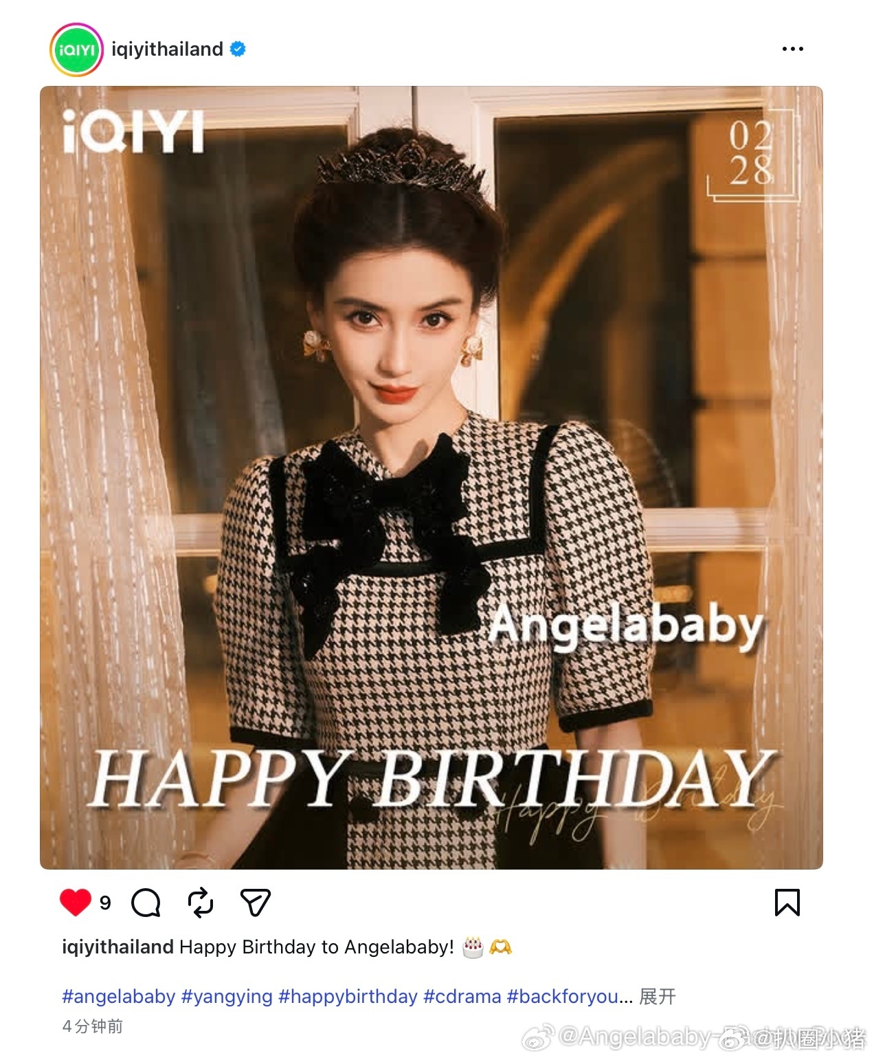 爱奇艺国际版、泰国版、马来西亚版、中国香港版、印度尼西亚版在海外社交媒体平台给Angelababy送生日祝福!鼻姐生日快乐angelababy0228生日快乐Angelababy37岁了