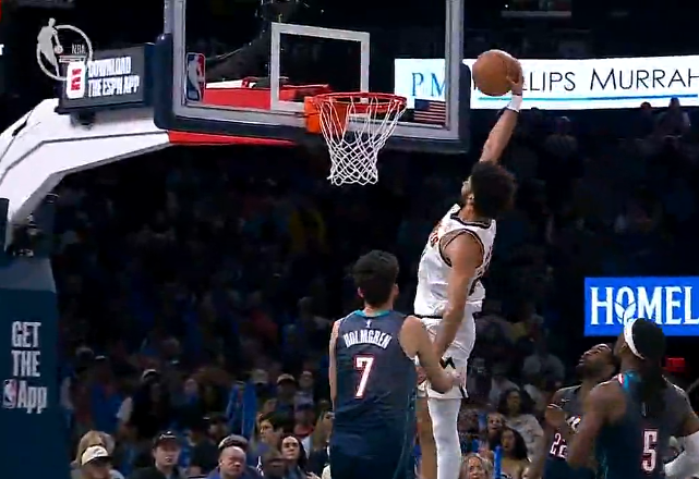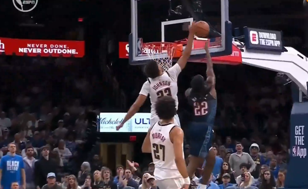 默里突破完成单臂滑翔劈扣,约翰逊身后追防上演钉板大帽
