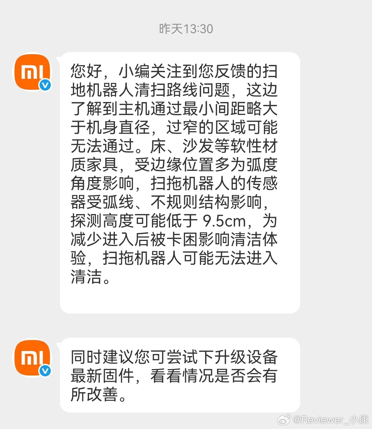 小米M40S问题,官方回复,柜门空间可能低于9.5mm,所以扫地机器人不进去清扫。