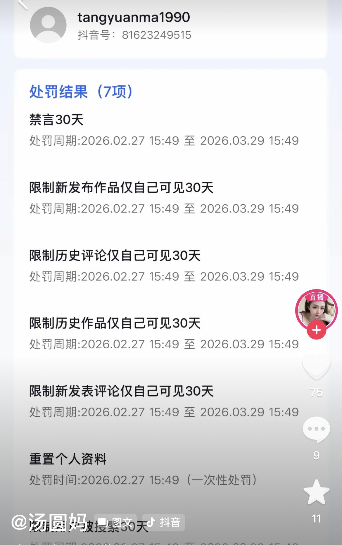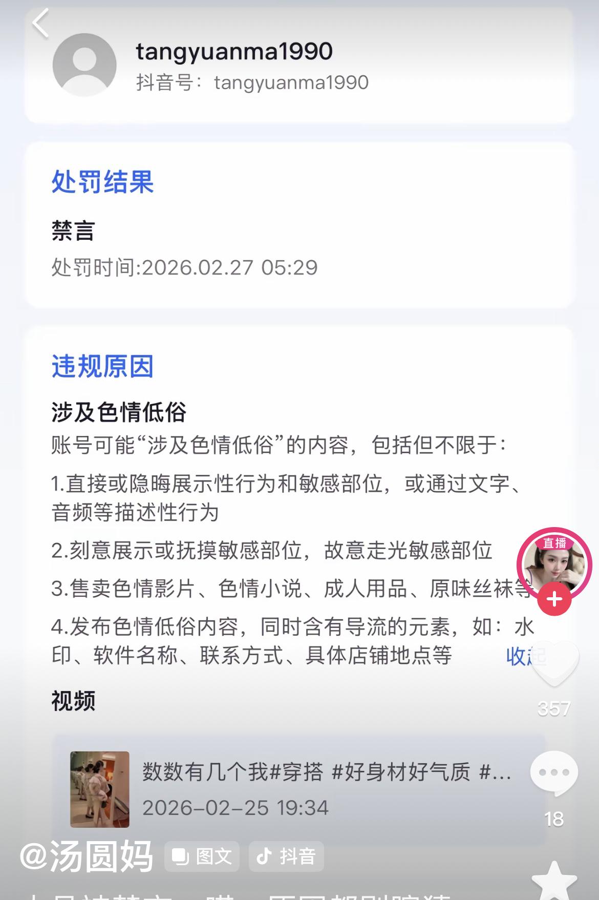 27号晚上10点多,汤圆妈小号直播了,直播页面上写着大号禁了1个月! 评论区问她春节去澳门了吗? 然后、她说,以后大号发视频,小号直播,很多人都有直播号! 小号的置顶视频里,有禁言30天的处罚截图和禁言的原因:账号违规,涉及色情低俗! 今天搜了下,小号汤圆妈也没有搜到,不知道咋的!