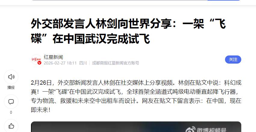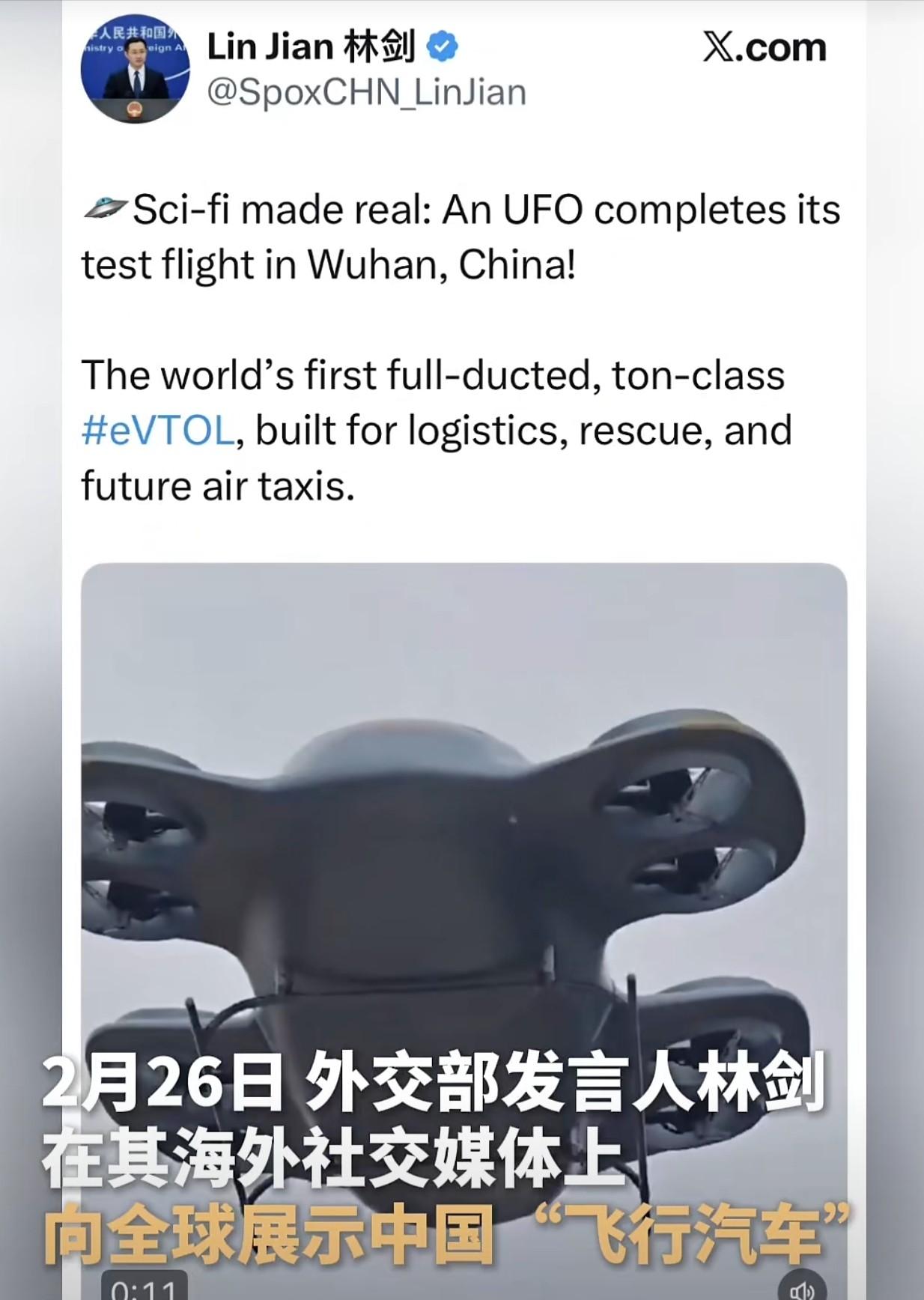 未来已至!2月26日,外交部发言人林剑于海外社交平台,向全球展示了湖北武汉自主研发的全球首架全涵道式吨级电动垂直起降飞行器。 未来已经到来,这绝不是科幻,不是遥不可及的设想,而是真真实实,一辆“飞碟”般的国产eVTOL,站在了全球新能源航空的最前沿。 可以说,这款飞行器一亮相,直接让全世界看到了中国制造的全新姿态。 很多人第一眼看到照片,都会觉得这不就是外国大片里的空中飞车吗? 但其实,咱们国家现在真的造出来这东西,而且它不光能飞起来,还带着满满的中国智慧和创新。 从企业研发到性能测试,全部是自主原创,连高端配件都是国产。 大家以前总觉得高端飞行器什么的只有欧美或者日韩能搞,但现在以国内企业为主力,打破国外对相关技术的垄断,真正实现全程可控,这种里程碑式的技术突破不仅让“中国产品”变成了“中国创造”,更让我国的低空经济和高端制造,还有产业链上下游,迎来了前所未有的机遇。 聊到飞行器的设计,很多人喜欢研究它为啥敢号称“未来飞碟”。 其实最大区别就是“全涵道式”这四个字。 简单说,它就像个更安全更省空间的涡扇,所有旋翼都被包在机体舱里,外观流畅没有裸露螺旋桨,解决了几乎所有人对直升机那种大转叶安全和噪音的担忧。 看着紧凑的机身,却能最大起飞1.2吨,能带4个成年人和他们的行李,载重能力直接拉满。 你要说占地面积,它起降只需要一个普通客厅大小的地方,30平米完全够用了。 想象一下,这样的体积进小区、停写字楼屋顶,比停飞机场还方便,城市交通场景兼容性也非常高。 动力方面纯纯的电驱,属于“零排放”高科技产品。 而且在继续提升能量密度的情况下,已经能实现低噪音飞行,比很多油改电的准飞行器先进一大截。 经过累计超130架次的试飞,数据显示飞行器高度稳定,无论风雨挑战,智能控制系统全程配合,为飞行安全加装了多重保险。 不论是城市环境的突发状况,还是极端天气下的飞行,数据表现都很优秀,这些其实都是国内研发团队靠着持续攻关、技术积累和不断试验得出来的真功夫。 实际上,有多项飞控、电池管理和气动设计已领先世界,属于全球的顶级水准。 如果非要说这架飞行器最迷人的地方,应该就是“智能”、“高效”、“安全”这三位一体的特性。 你既能享受到超前的科技感,还能实际看到它应用在日常场景。 比如城市早晚高峰,地铁堵得走不动,路面运输压力大,现在这类eVTOL就可以解决生鲜、药品等紧急物资配送,特别是保冷要求高,或者急需医疗资源进社区,这种空中解决方案既不堵路又高效。 还有极端天气发生时,比如城市洪水、地震等灾害应急,这类飞行器可以第一时间深入现场,快速送达救援装备和人员,甚至用于转移伤员。 除了物流救援,当前高景气的低空文旅也成了全涵道式飞行器的新蓝海。 你在城市上空参加观光飞行活动,不用担心传统直升机的“挂外浆”带来的安全焦虑,视野好,噪音低,带来的科技体验完全拉满。 而且等到未来拿到民航局适航资质后,这玩意的最大C位就是“空中飞的”“空中巴士”。 具体来说就是快速连通城市区域,让“地面+空中”的立体交通诞生,不仅通勤效率飙升,也极大减少拥堵。 试想一下,10分钟飞越武汉三环,早上起床还能多睡20分钟,生活节奏全面升级,是不是很吸引人? 除了城市日常和文旅需求,更多产业场景其实早就跃跃欲试了。 电力巡检,林业防护,航空测绘、公安巡逻,全涵道eVTOL都极具应用价值。 比如高压电塔和山区林场,以前靠人爬塔、直升机绕线难度高、风大不安全,现在全包裹式机身,能贴近目标任务区域,高效飞行且抗风能力好,大幅提升作业效率。 相关行业只要用上这样可控、低噪、可编组飞行的新装备,不仅降低人力投入,还保证了人员和设备的高度安全。 实际上,国内产业界已经展开多轮合作,未来这些飞行器会成为各行各业的标配装备。 更厉害的是,普通老百姓其实也有机会体验这种“空中出行”新方式。 随着国产化和规模量产,相关厂家已经提出未来售价要实现亲民化,不再是只有高净值人群能玩的“高端体验”,而是更像滴滴、外卖共享单车那样推出“共享空中巴士”。 只要换个APP,约飞一次文旅观光或者短距离出差,不需要提前数天预订,直接几分钟之内飞得稳稳当当地到目的地,提高大众日常出行效率。 类似方案在欧美其实进展很慢,因为政策和适航流程繁琐,但在我国就有望依托政策红利和低空空域快速试点,率先普及城市载人短途空中交通。 参考: 红星新闻——外交部发言人林剑向世界分享:一架“飞碟”在中国武汉完成试飞