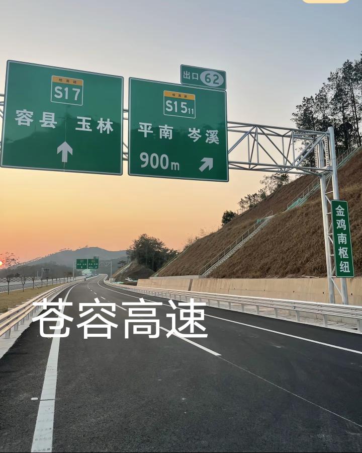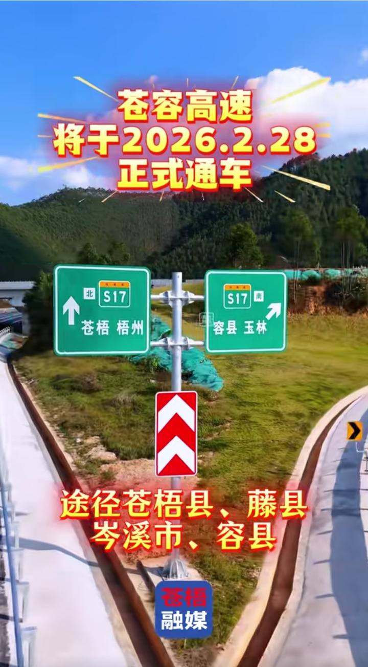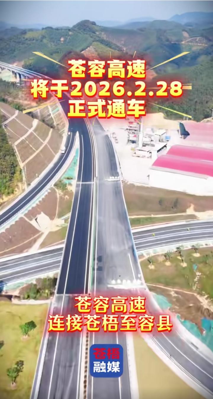 喜讯,梧州苍梧途经藤县至玉林容县的苍容高速将于今天(2月28日11时)正式通车,梧州和藤县开车来往容县和玉林还有北海等地将更加便捷,相比之前走G65包茂高速岑溪段可以节省30分钟左右,苍容高速全长约105公里,起于苍梧县金田村东侧与G6517柳梧高速T型互通,止于容县十里镇江口村东侧接G80广昆高速,沿途将在人和镇、梧州机场、同心镇、象棋镇、浪水镇等地附近设互通收费站,沿途设西江和石表山服务区2对,双向四车道,设计时速120公里每小时,苍容高速建成通车后将极大方便周边区县和沿途乡镇相互来往,容县也将正式迎来第二条高速。