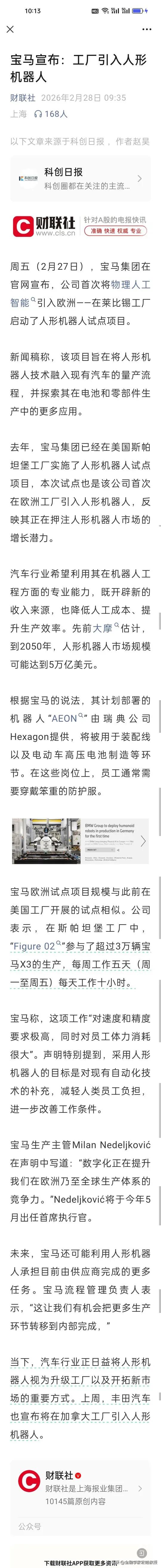 刚参观完宇树机器人,宝马这么快就落地人形机器人了! 根据《财联社》报道,前脚宝马董事长齐普策还在杭州宇树科技踮着脚、录着视频,惊叹宇树的轮足结合设计“从未见过”,后脚宝马就在莱比锡工厂启动了人形机器人试点,连美国斯帕坦堡工厂的“Figure 02”都已参与生产超3万辆车。 这哪里是参观,分明是带着明确目标来“取经”。从赞叹轮足创新到快速落地产线,宝马用行动证明:中国机器人技术,已经成为全球车企升级的重要参考,连传统车企巨头都在抢着抄作业。