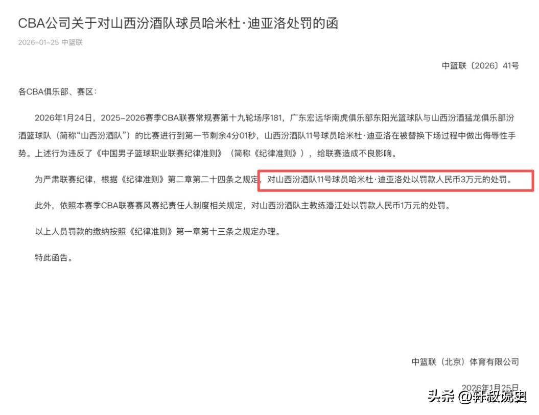 重罚!山西球迷吐痰,吐到北京球员脸上,山西篮协副主席:臭老鼠[送心] 北京时间1月26日,太原的寒夜里,山西汾酒体育馆内本该上演一场虽败犹荣的悲壮。迪亚洛在仅剩0.8秒时接球,转身,迎着防守人扔出那记超远三分,篮球划过一道高弧线空心入网。 那一刻,整座球馆几乎要被引爆。但裁判反复回看后确认,出手超时,进球无效。比分定格在86比87,山西队吞下三连败。 这场球的过程其实很纯粹,残阵出战的北京首钢,少了周琦、赵睿、曾凡博等绝对主力,却用铜墙铁壁般的防守撑到了最后。迪亚洛前三节被限制得很难受,直到末节才爆发,全场砍下23分10篮板7助攻的准三双。 最后4.1秒,张才仁的补篮反超,留给山西队0.8秒。迪亚洛投进了那记神奇的压哨球,只可惜时间老人这次没有站在主队这边。这种从地狱到天堂再瞬间跌回地狱的落差,足以让任何铁杆球迷心碎,但这绝不是失控的理由。 然而,比输球更刺眼的一幕发生在赛后。当北京队球员退场走向通道时,看台上传出了辱骂声。据现场记者和北京媒体事后描述,有球迷做出了更出格的举动,朝北京队外援杰曼的脸上吐口水。 画面中,杰曼用手擦拭着脸颊,表情从愤怒转为无奈。北京队的陈盈骏当场暴怒,指着看台向安保人员抗议。 老将雷蒙虽然也在气头上,但还保持着冷静,他一边劝阻队友,一边对着安保喊话,“骂几句也就算了,但不能吐口水!”这句话道破了职业球员的底线,球场上可以针锋相对,甚至可以互喷垃圾话,但人格尊严不容践踏。 1月28日,CBA官方的一纸罚单让这起事件尘埃落定。经赛后认定,山西主场观众对北京队球员有侮辱性言行,且赛区后续未予有效处理,对山西汾酒俱乐部核减联赛经费2万元,并根据“青少年友好型赛场记分制度”扣除3.75分。 官方函件措辞严厉,要求赛区规范球迷观赛行为,加强对现场球迷的引导和管理。值得注意的是,这是CBA本赛季首次针对“观众侮辱性言行”与“球员回应手势”开出的双向罚单,既敲打了主场管理,也警告了球员不得以暴制暴。 1月24日,山西队刚因为迪亚洛在比赛中做出侮辱性手势被罚款3万元,主教练潘江也被连带罚款1万元。广东队外援甚至在网上晒出P图调侃山西队打球风格“太硬”。如今球迷又来这么一出,太原赛区可谓是雪上加霜。 对于山西队而言,真正的隐患其实还在场上。算上这场与翟晓川冲突吃到的技术犯规,迪亚洛本赛季的技犯次数已经悄然累积。 按照CBA规则,累计到一定次数将自动停赛。目前10胜10负排名中游的山西队正处于冲击季后赛的关键卡位期,如果核心外援因为非战斗减员被禁赛,那才是真正的灭顶之灾。 一场篮球赛的输赢本是兵家常事,但看台上的失控往往只需要几秒钟的冲动。赛后,有山西本地资深媒体人在社交平台发声,没有护短,而是直言这种极端球迷是“一颗老鼠屎坏了一锅汤”,呼吁依法严惩,把这种人拉进黑名单。 对于CBA联盟来说,这张2万元的罚单和3。75分的扣分,或许只是开始。如何在制度上真正杜绝“球场痞气”,如何让那些把赛场当做出气筒的极端分子付出更高代价,才是留给联赛管理者的长期考题。 你觉得对于这种朝球员吐口水的极端行为,除了事后罚款,赛区安保有没有权利当场将其永久拉入黑名单?如果你是现场安保,第一时间会怎么做?