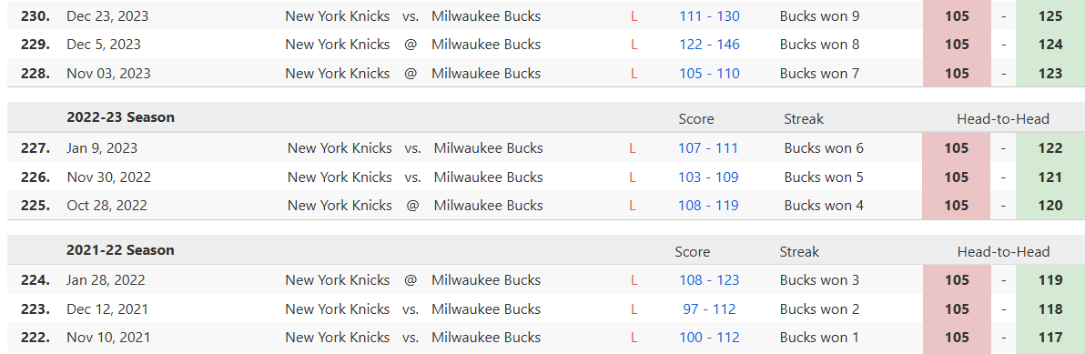 尼克斯21年至23年面对雄鹿一度遭遇9连败,24年至26年面对雄鹿拿到7胜1负。