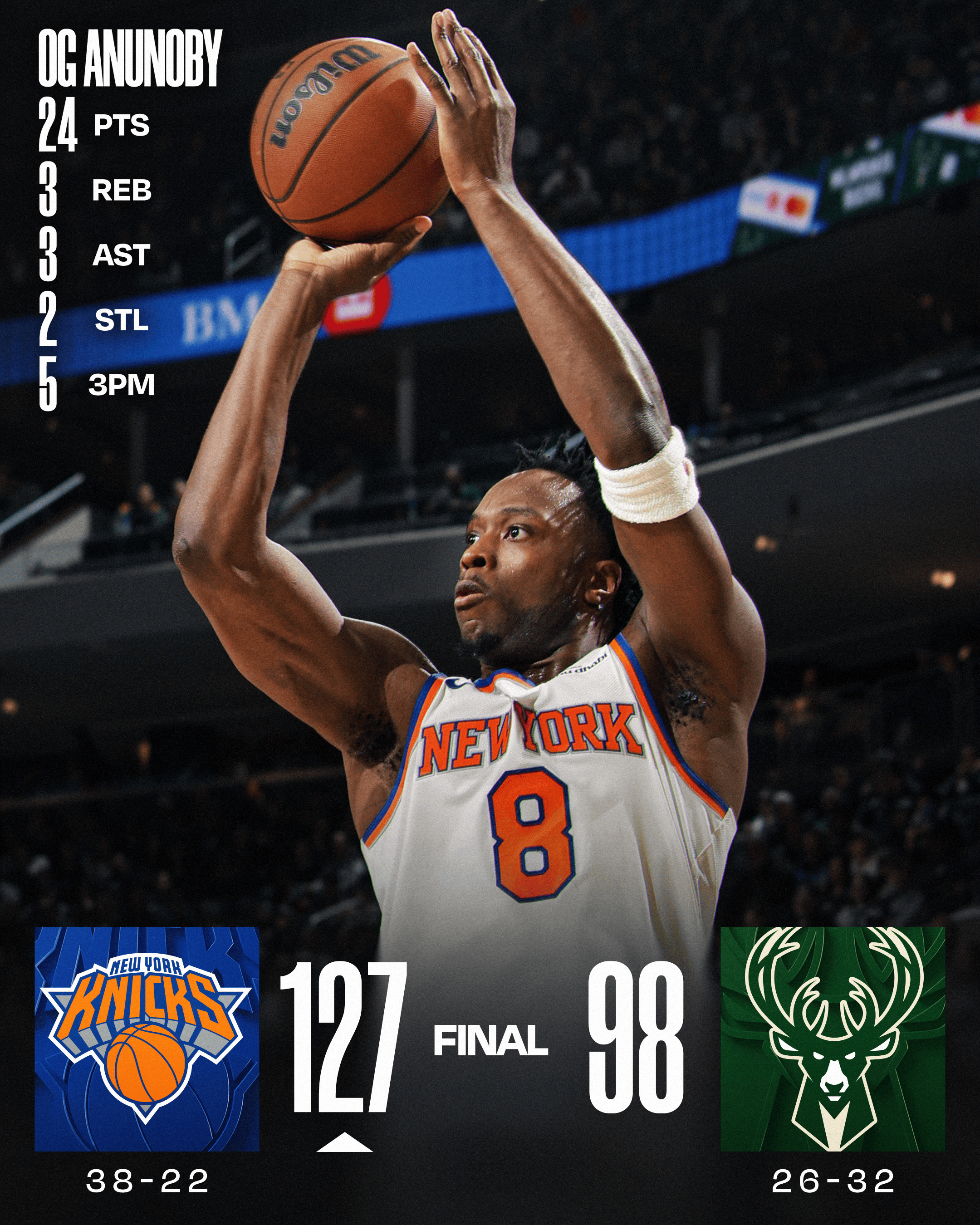 虎扑02月28日讯今天NBA常规赛尼克斯客场对阵雄鹿的比赛已经结束。全场战罢,尼克斯以127-98战胜雄鹿。
