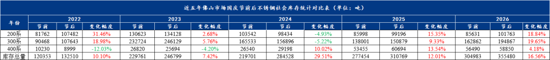 2022-2026年库存变化核心特征近五年,佛山不锈钢社会库存在春节前后均以累积为主要趋势,核心驱动因素源于节前钢厂持续发运与节后需求恢复滞后的时间错配,叠加假期期间公仓“只进不出”的运营模式,共同推动库存短期上行。2022年,受疫情反复与物流阶段性受阻影响,节前货源集中到港,而下游复工复产节奏缓慢,市场出现了近五年最为显著的节后增库,成为当年库存曲线的重要峰值。2023年,行业逐步走出疫情影响,节前下游备货理性,钢厂发运节奏趋于平稳,叠加节后需求快速回暖,当年春节前后的库存增幅显著收窄,呈现出“温和垒库、快速消化”的态势。2024年,市场迎来阶段性复苏,下游制造业订单回暖带动节前备货意愿提升,同时钢厂为满足节后潜在需求加大发运,使得库存增幅再次扩大,重回高位增长区间。2025年,行业进入供需平衡调整期,上游产能释放放缓,下游需求稳步增长,库存变化回归理性,春节前后的增库幅度保持在温和水平,市场整体运行平稳。2026年,春节前后的库存延续增势,且在结构上呈现出鲜明特点。节前钢厂按计划发运的货源在假期期间陆续入库,而贸易商与下游企业集中放假,市场成交几乎停滞,库存消化渠道受阻。节后,尽管市场商家集中复工,但下游制造业复产存在时间差,需求释放相对滞后,供需节奏暂未匹配,使得库存继续保持累积态势。