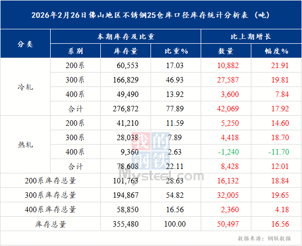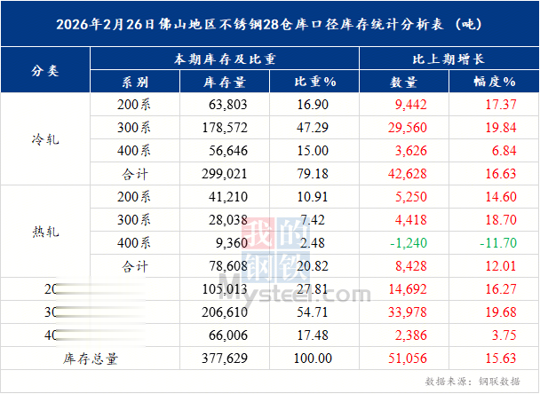 引言:春节作为国内不锈钢市场的关键季节性节点,其前后的库存变化始终是反映供需节奏与市场情绪的核心指标。近五年来,佛山作为华南地区最大的不锈钢集散地,其社会库存在春节期间均呈现出典型的季节性垒库特征,但受宏观环境、行业周期及供需格局影响,各年份的增库节奏、结构特点与幅度表现存在显著差异。2026年春节过后,佛山不锈钢库存延续增势,且在结构上呈现出新的特点,为全年市场走势奠定了初始基调。2022-2026年库存变化核心特征近五年,佛山不锈钢社会库存在春节前后均以累积为主要趋势,核心驱动因素源于节前钢厂持续发运与节后需求恢复滞后的时间错配,叠加假期期间公仓“只进不出”的运营模式,共同推动库存短期上行。
